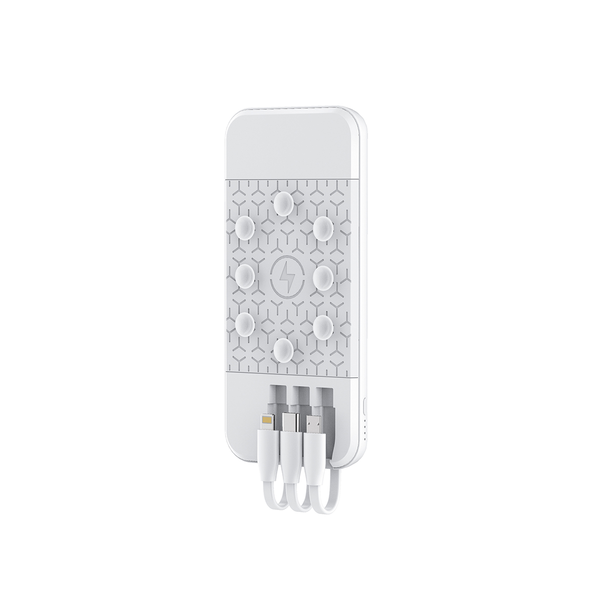 Power Bank Sissa. - Con una capacidad de 10,000 mAh,  fabricada en plástico ABS, un material duradero y resistente, está equipada con ventosas en la parte posterior (estas ventosas permiten adherir el power bank a la superficie de tu dispositivo móvil ), con una inclusión de 3 cables de carga integrados ( micro USB, USB-C y Lightning) compatible con dispositivos Apple y android. Incluye caja de cartón individual. Es un compañero confiable para mantener tus dispositivos móviles cargados en cualquier momento y lugar.