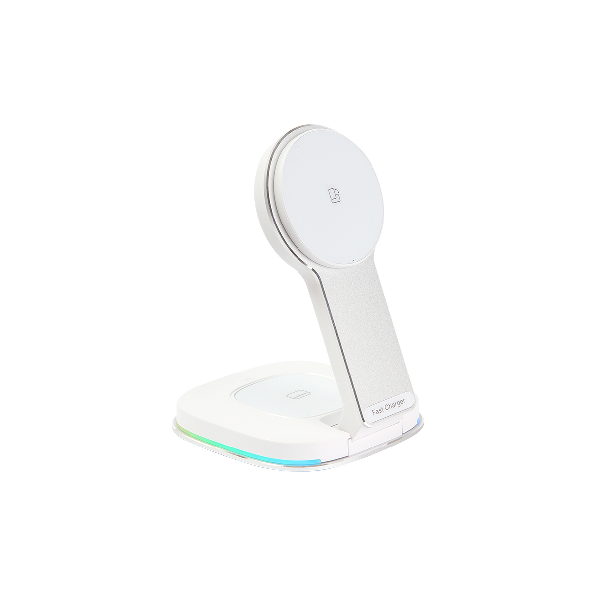 Cargador Elva. - Cargador inalámbrico multifunción (reloj, audífonos y celular), fabricado en ABS, Policarbonato (PC), silicón y aleación de aluminio. Potencia de carga de hasta 15 W.  Diseño plegable.