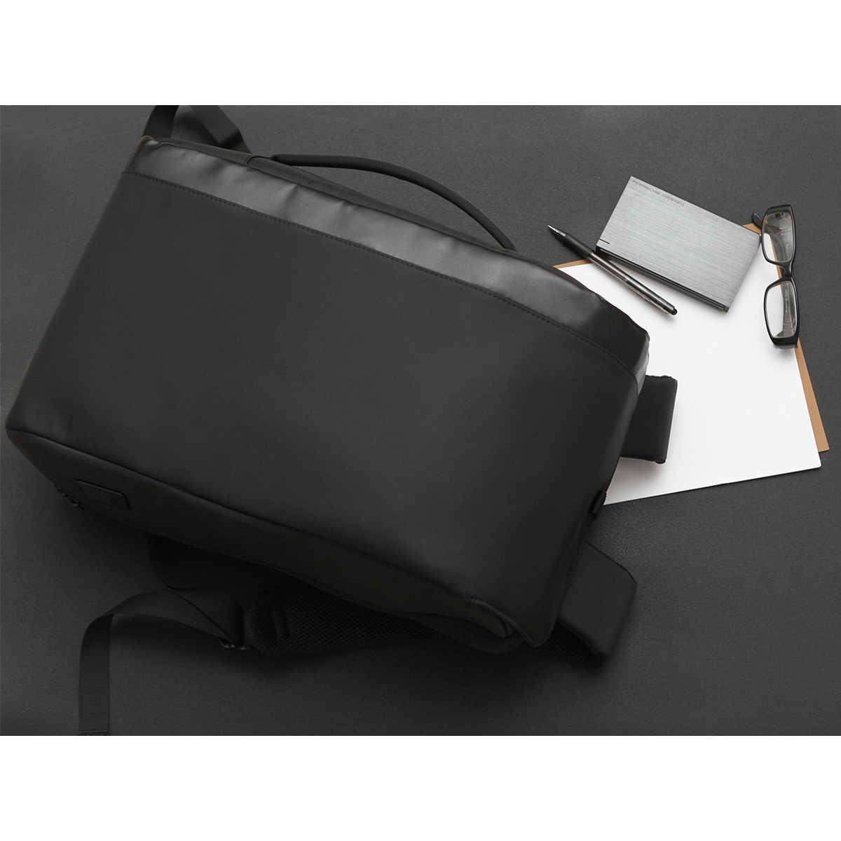 Backpack Wadi. - Backpack fabricada en material repelente al agua, con salida para carga USB, compartimento para laptop o tableta inteligente, tirantes acolchonados ajustables, asa lateral y cinta trasera para fácil transportación.