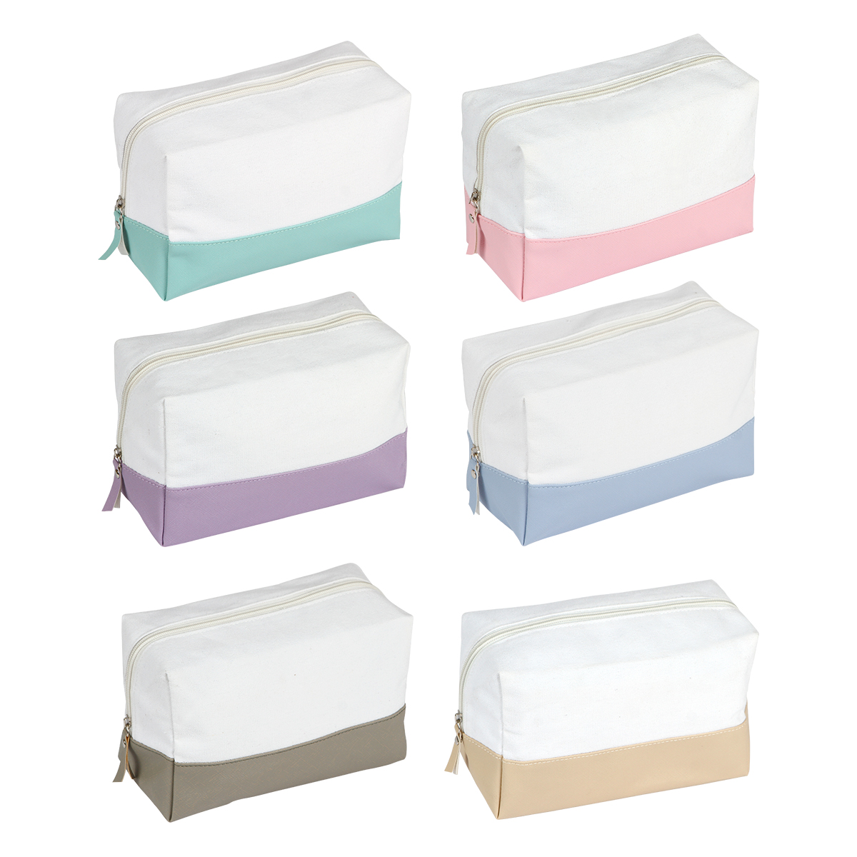 Bolsa Trigoria. - Bolsa cosmetiquera fabricada en curpiel y lona de algodón, cuenta con un compartimento principal, cierre metálico. Diseño a varios colores pastel de tendencia y la parte superior blanca.