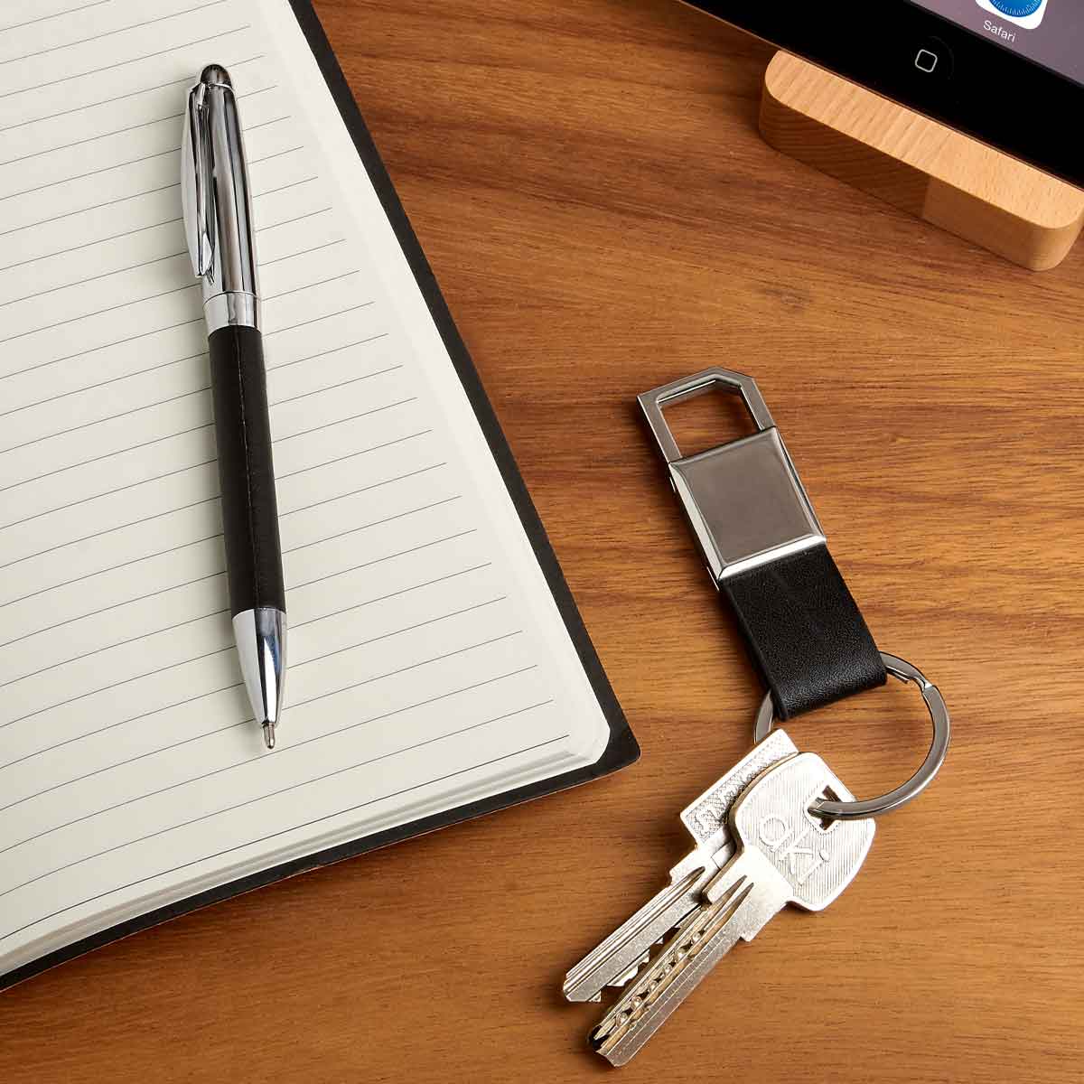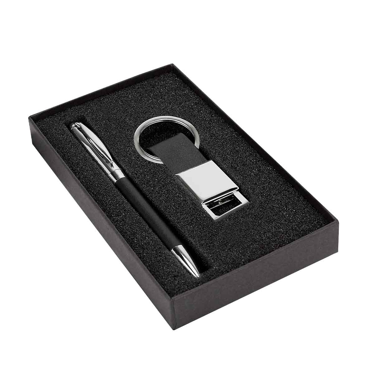 MATERIAL: Curpiel / Metal MEDIDAS: 3.3 x 9.5 cm Llavero / 1 x 13.3 cm Bolígrafo IMPRESION: Láser / Serigrafía MED. EMPAQUE: 32 x 54 x 35 cm PESO EMPAQUE: 12.1 Kg PIEZAS EMPAQUE: 100
