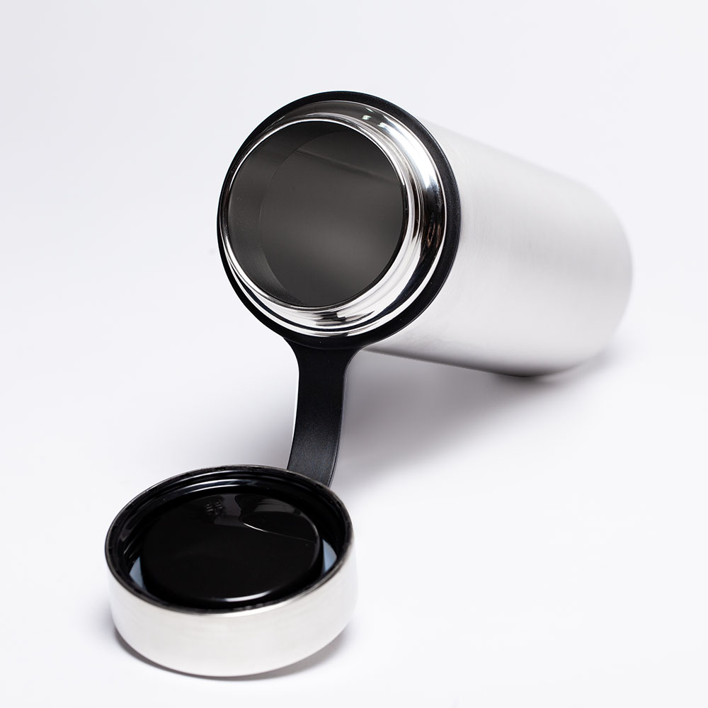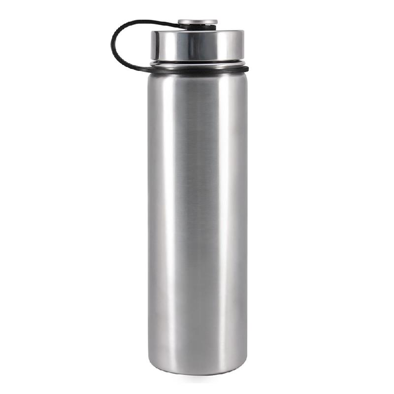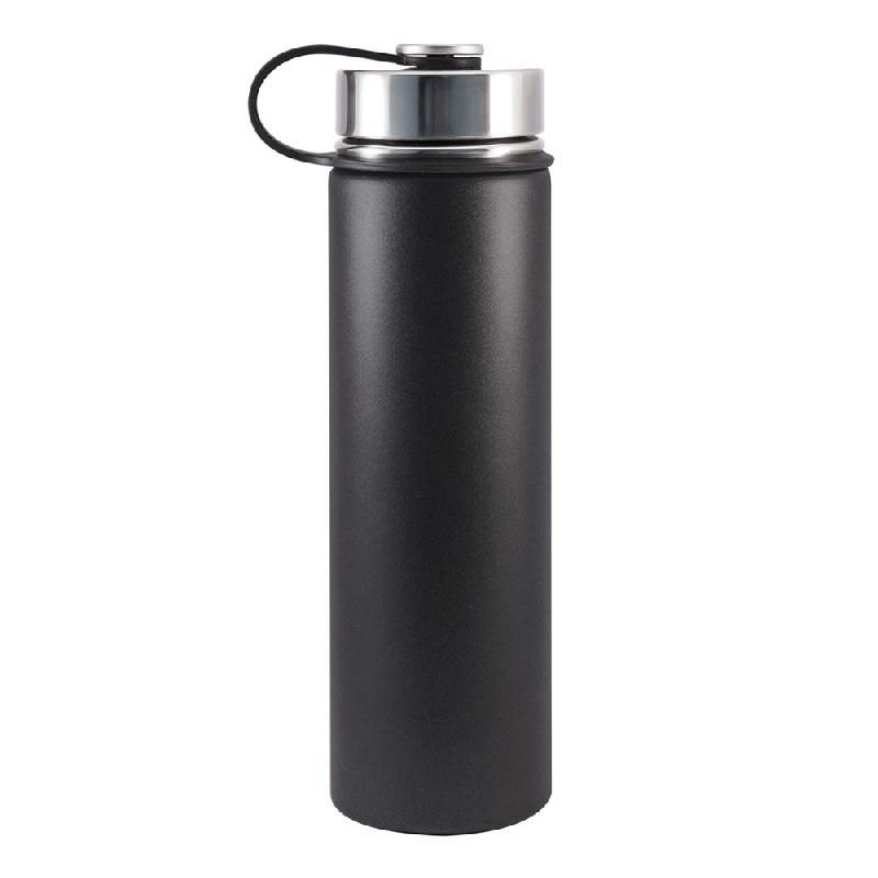 BOMBAY Botella de acero inoxidable de doble pared insulada al vacío para mantener las bebidas frías o calientes por más horas. Terminado Arena o Acero. Tapa con cierre de rosca y agarradera. Capacidad de 650 ml. Certificación FDA. - MEDIDAS: 25 x Ø 7,3 cm