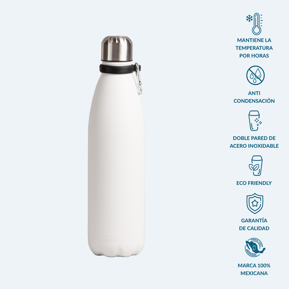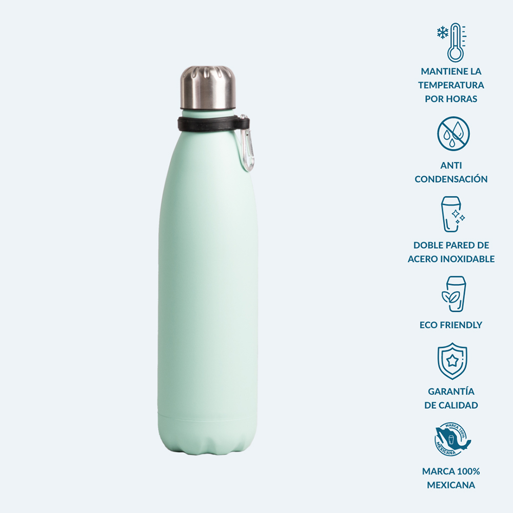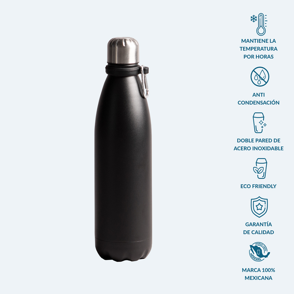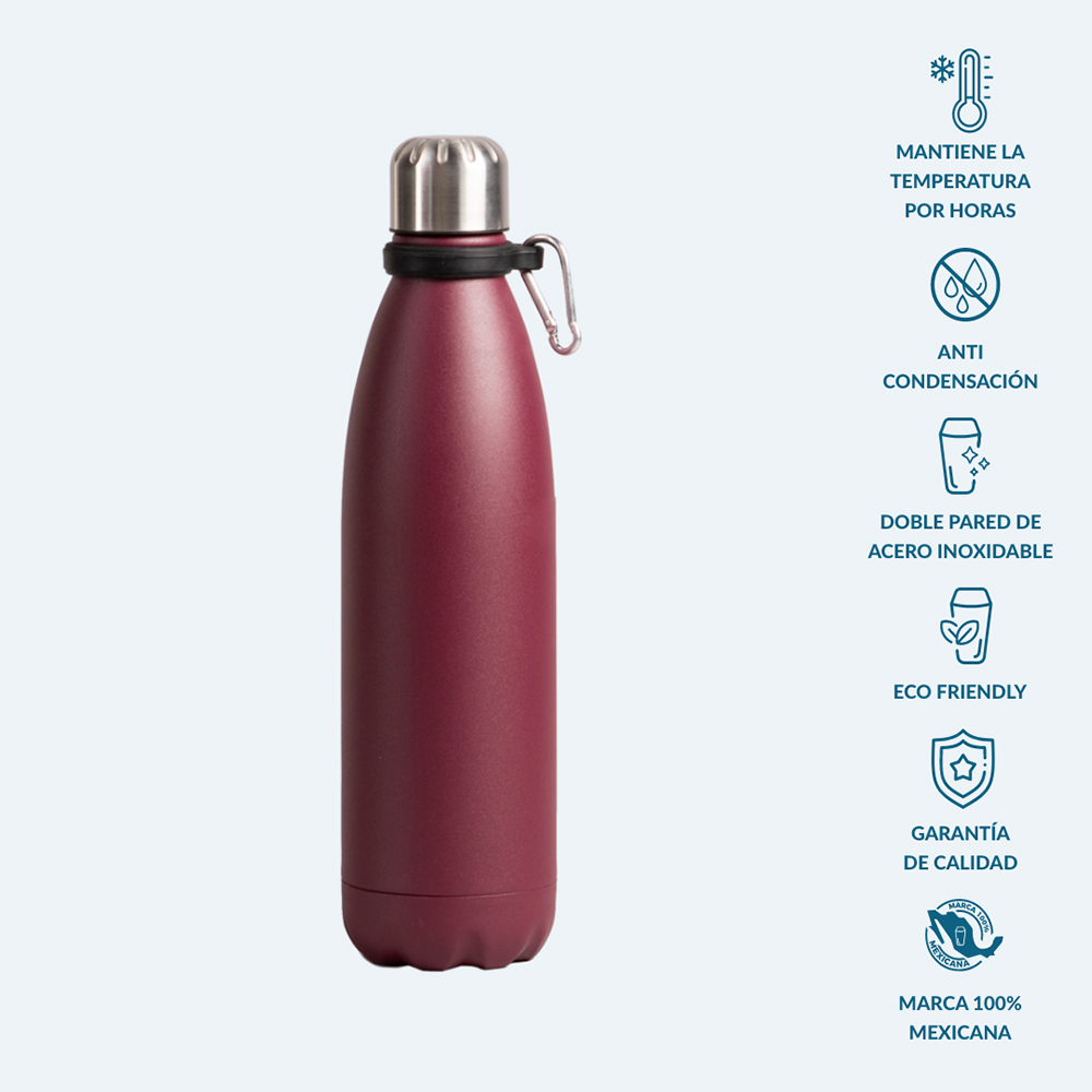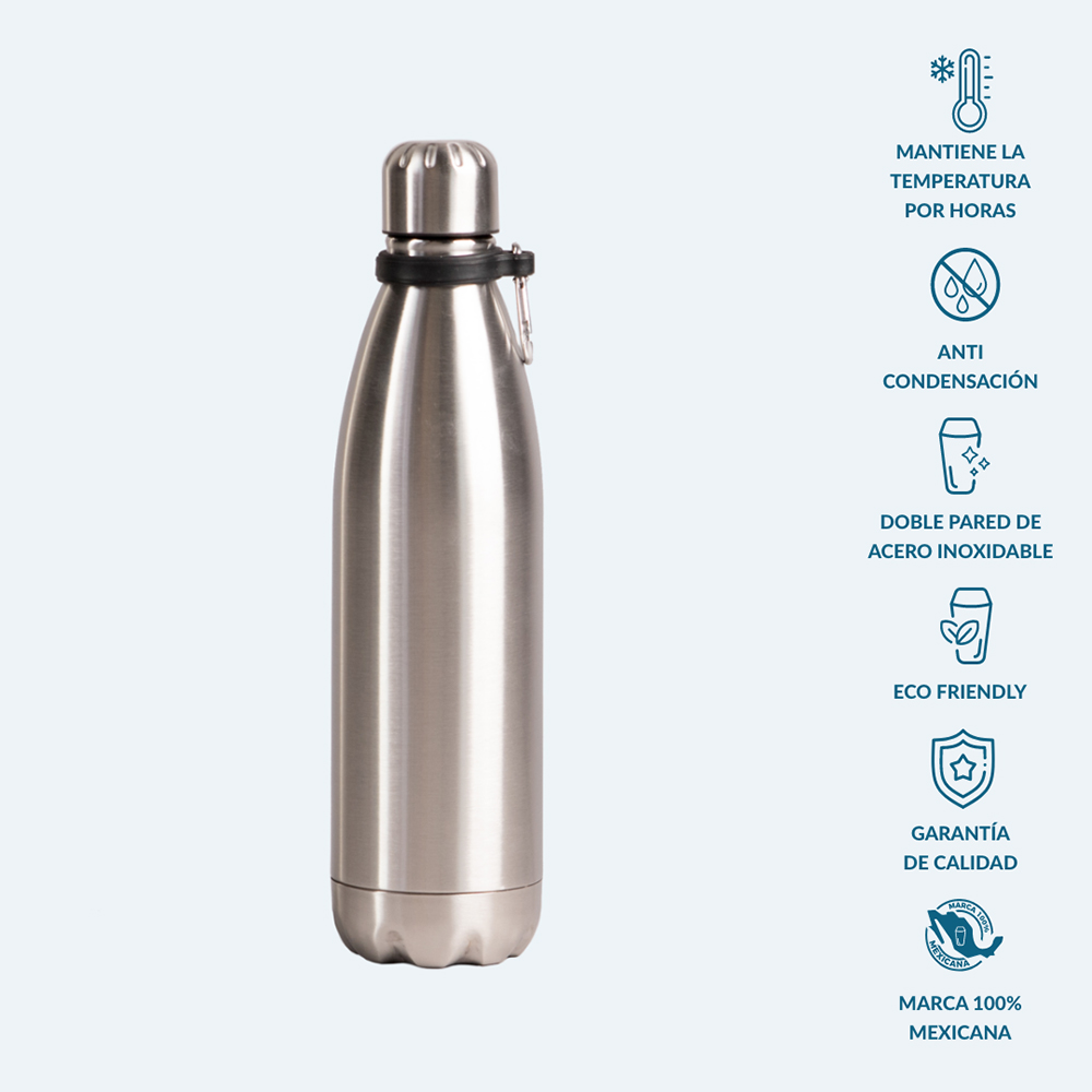 BOTELLA 26 oz Botella para agua o bebidas, fabricados con acero inoxidable de grado cocina libre de BPA, cuenta con una doble pared grado 18/8 anti condensación, la cual permite mantener la temperatura ideal de tu bebida hasta el último trago, aislando el calor y el frío del ambiente. Su composición de alta calidad lo vuelve resistente a la perforación y corrosión, brindado un producto de alta durabilidad. Cuenta con un diseño ergonómico de fácil agarre y una tapa de cierre hermético. Producto de fácil lavado, permitido en lavavajillas. Capacidad de 769 ml.