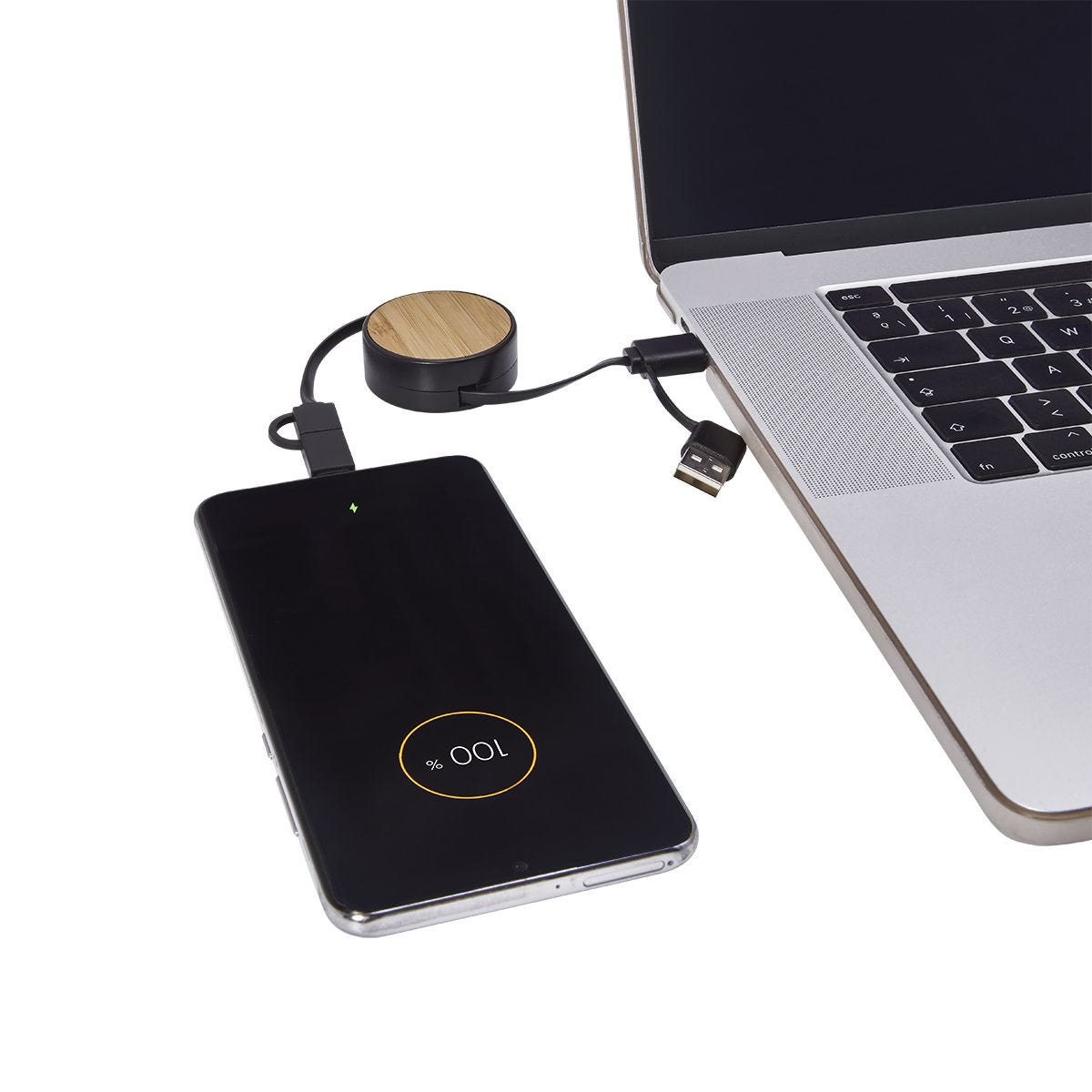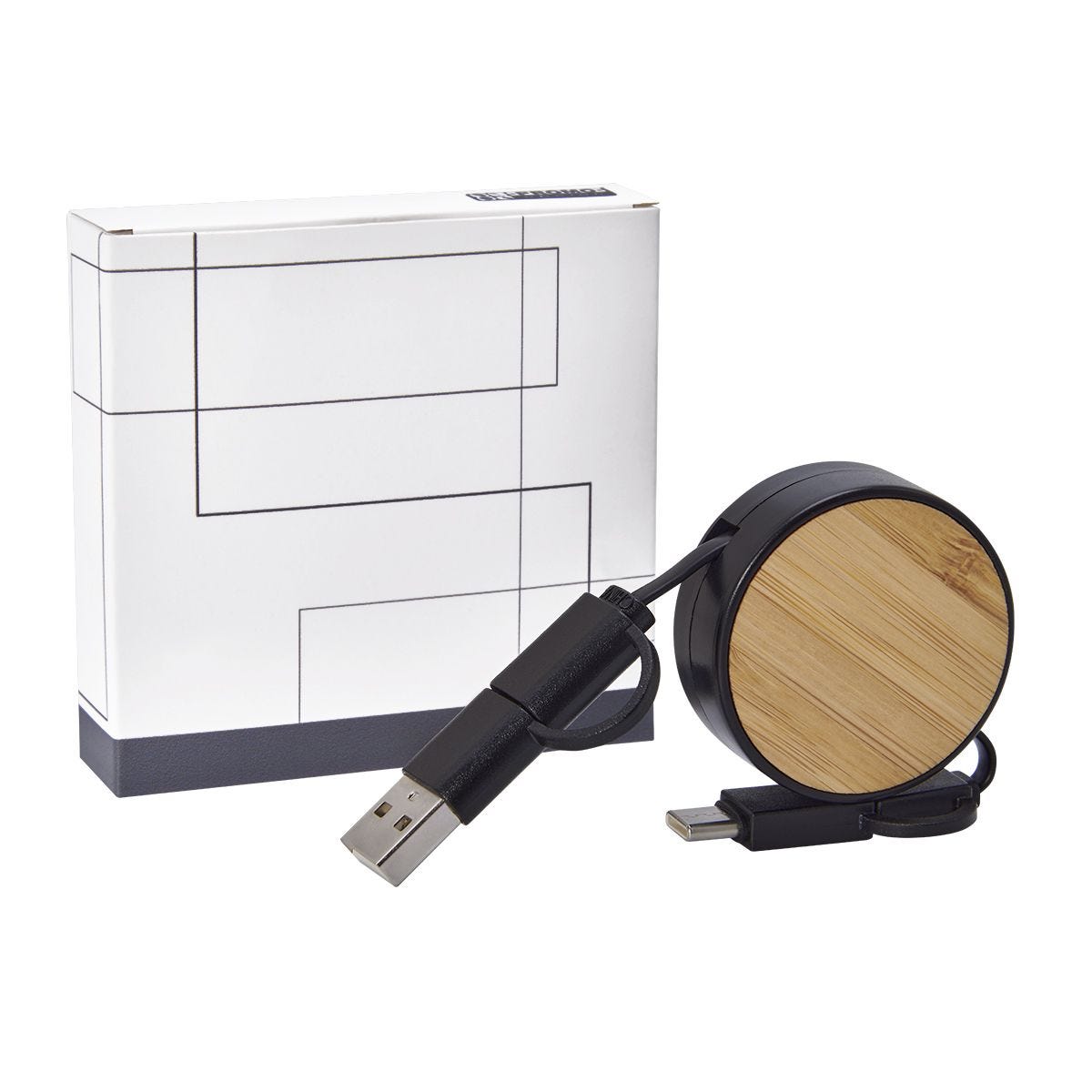 CABLE BOLTA - Cable cargador 3 en 1. Incluye conector de entrada USB y tipo C, conector de salida 2 en 1 con micro USB y lightning (8 pines) además de tipo C. Largo de cable 80 cm. El bambú es un producto natural el cual puede presentar variaciones en tonalidades y vetas.