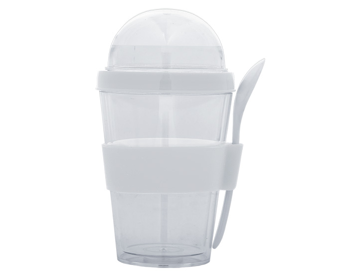 FROYO - Vaso de doble pared de plástico con cuchara. CAP. 300 ml. Presentación: caja en color blanco. *BPA FREE.