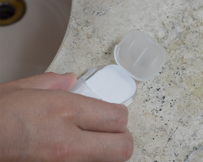 ROXIE - Estuche portátil con láminas de jabón, ideal para viajes. Se puede transportar fácilmente en la bolsa, bolsillo, mochila, etc. Las láminas se deshacen al contacto con el agua lo que permite que cumpla correctamente la función de un jabón convencional. Contiene 25 láminas.