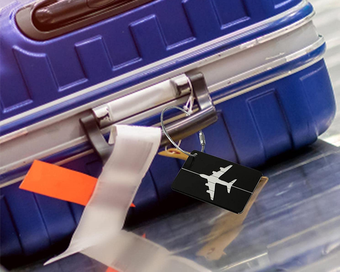 VUELO - Identificador de equipaje de aluminio con detalle de avión. Cuenta con una pulsera con seguro giratorio hecho de alambre galvanizado recubierto de PVC y una tarjeta para datos personales (español/inglés) con mica protectora.