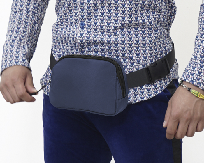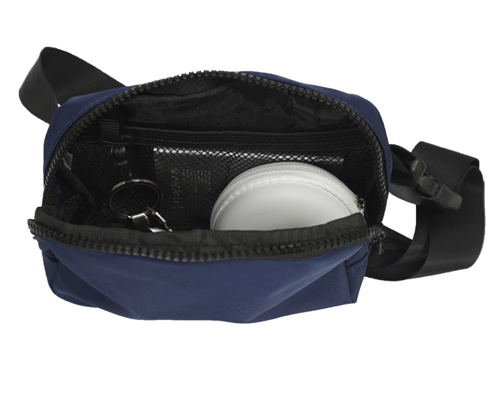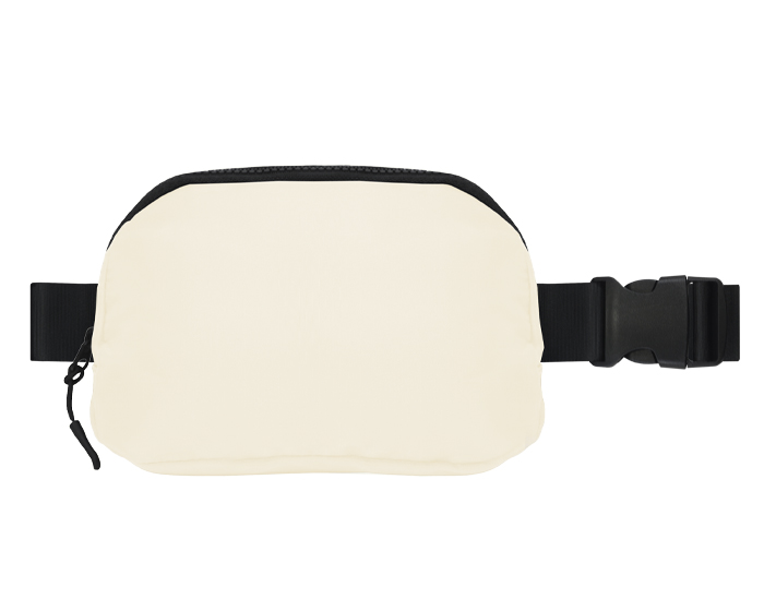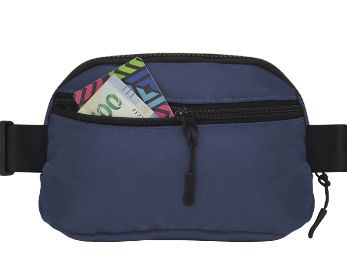 JUMP - Cangurera impermeable con cinta ajustable y broche de seguridad. Cuenta con 2 compartimentos uno principal y uno trasero, 2 tiradores en color negro, compartimento interno de malla con resorte y broche para colgar llaves.
