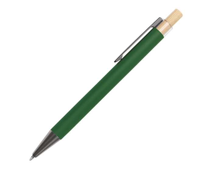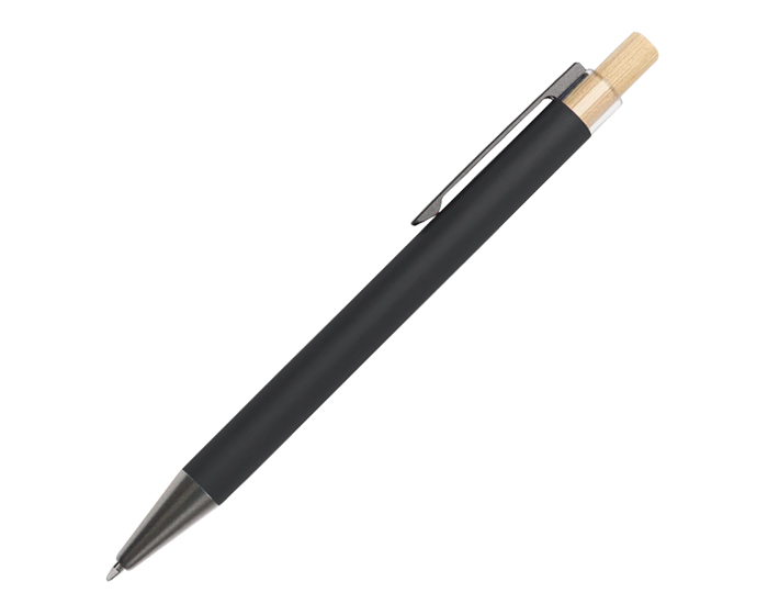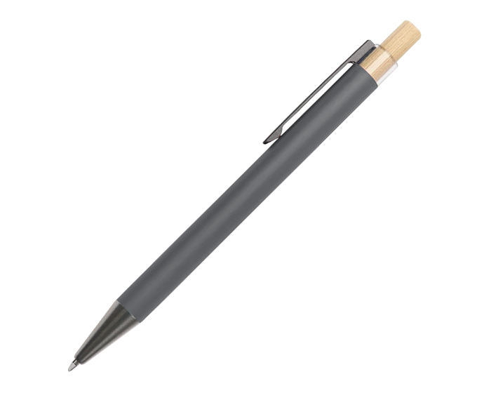 TEACHER - Bolígrafo de aluminio con mecanismo de click, acabado tipo rubber, tiene botón de bambú y detalle de plástico transparente donde se sujeta el clip metálico; clip y punta en color grafito.