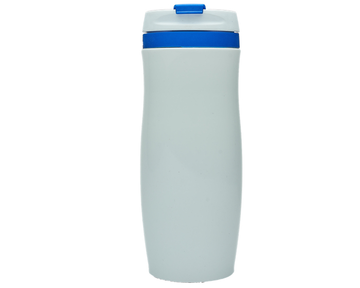 ZEKI - Termo metálico con diseño ergonómico, con acabado en esmalte blanco y banda superior de silicón en color. Cuenta con interior en acero inoxidable, tapa de rosca hermética, seguro para líquidos con bisagra en color y goma anti derrapante en la base. CAP. 400 ml. Presentación: caja en color blanco.