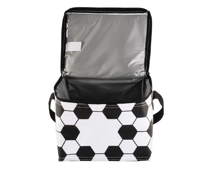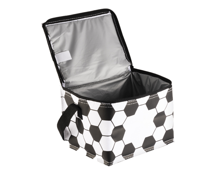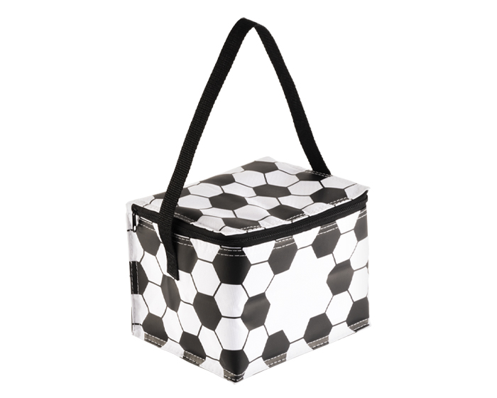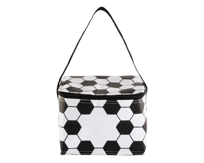 CASCARITA - Lonchera / Hielera rectangular con diseño de balón de fútbol soccer, tiene cubierta cosida e interior termosellado en plástico anti escurrimiento. Cuenta con cierre y correa larga. CAP. 6 latas.