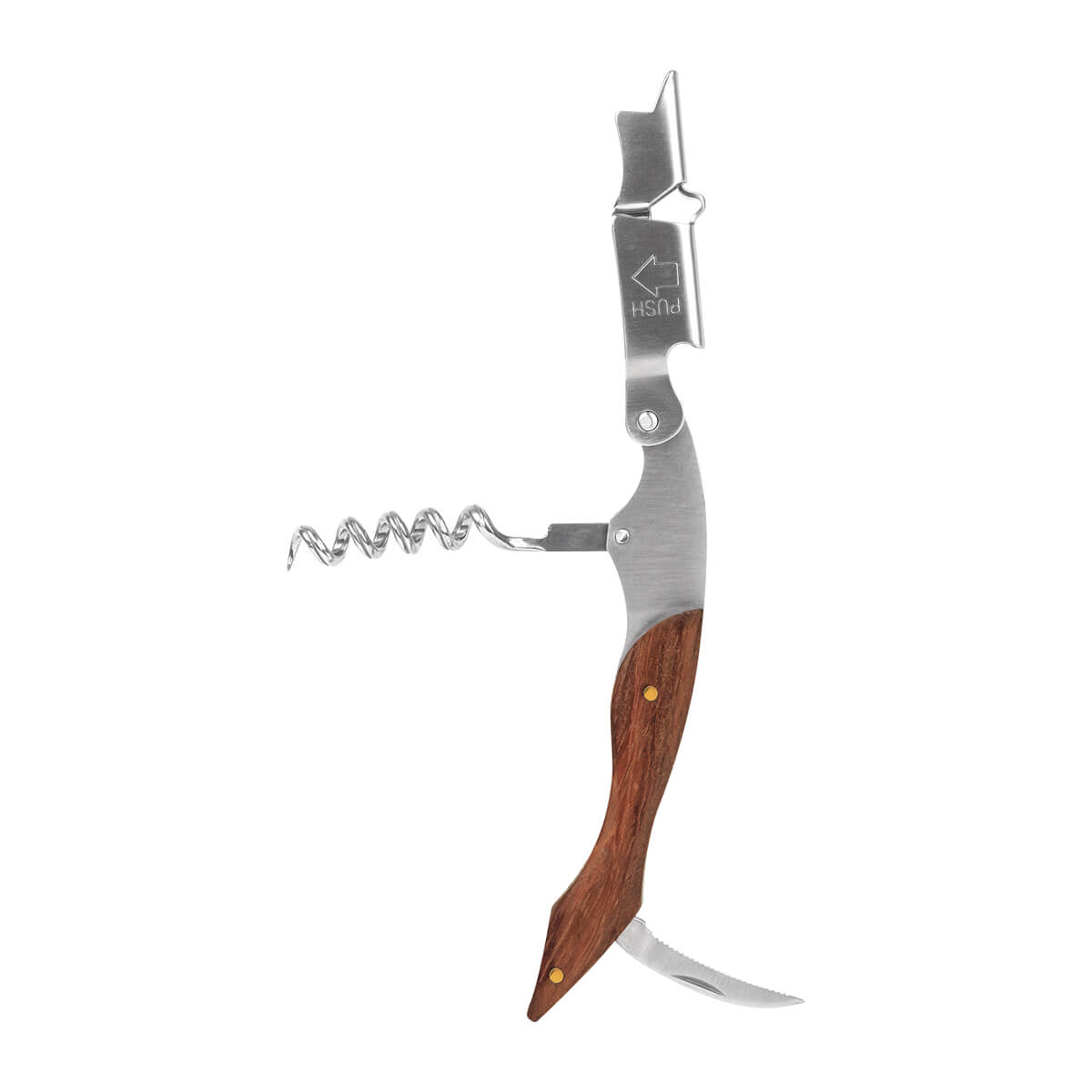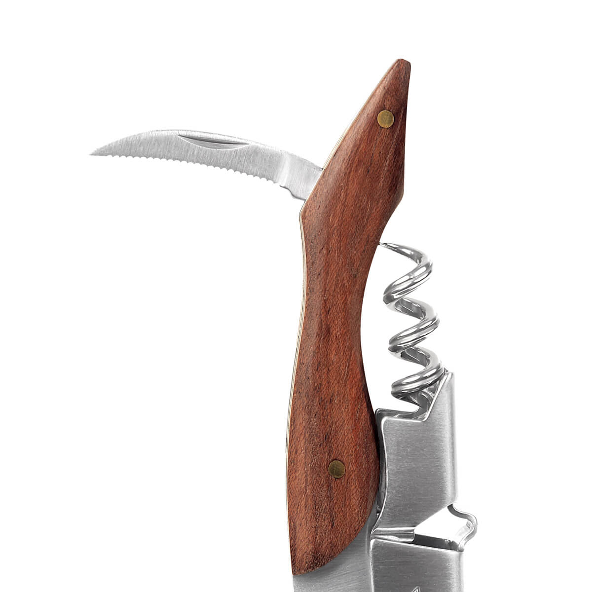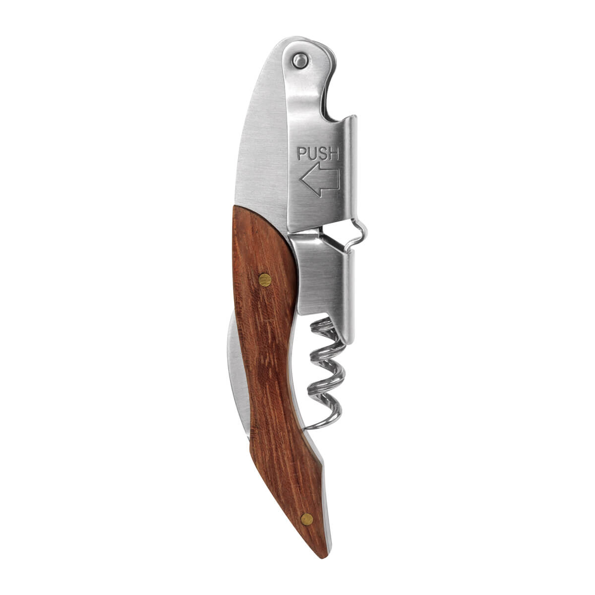 SACACORCHOS LIGNUM - Sacacorchos de acero inoxidable. Ideal para los más aventureros. Cuenta con un mango de madera, mecanismo de doble bisagra, sacacorchos, detapador de botellas y cortador de lámina dentado. Incluye elegante funda de curpiel y caja individual.
