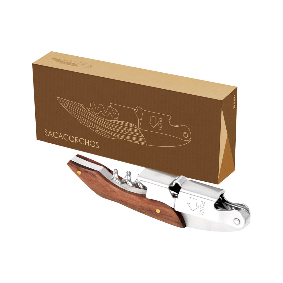 MATERIAL: Acero Inoxidable / Madera MEDIDAS: 3 x 12.2 x 1.6 cm Sacacorchos / 5.3 x 14 cm Funda IMPRESION: Láser / Tampografía MED. EMPAQUE: 28 x 31 x 31 cm PESO EMPAQUE: 14.6 Kg PIEZAS EMPAQUE: 100