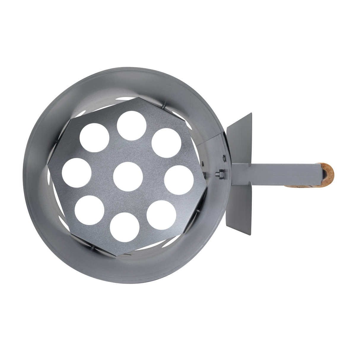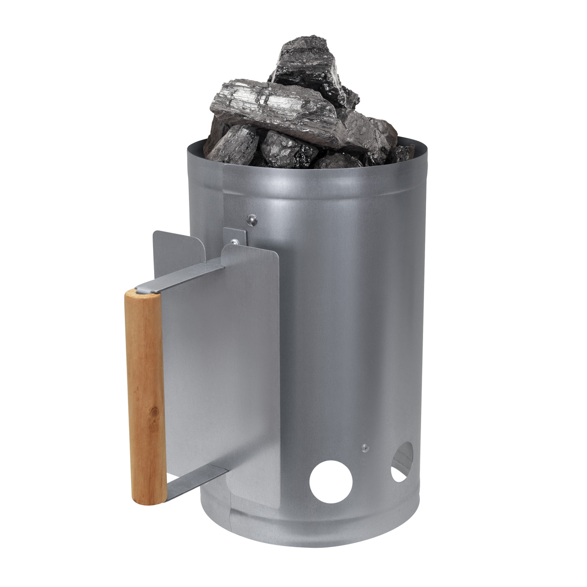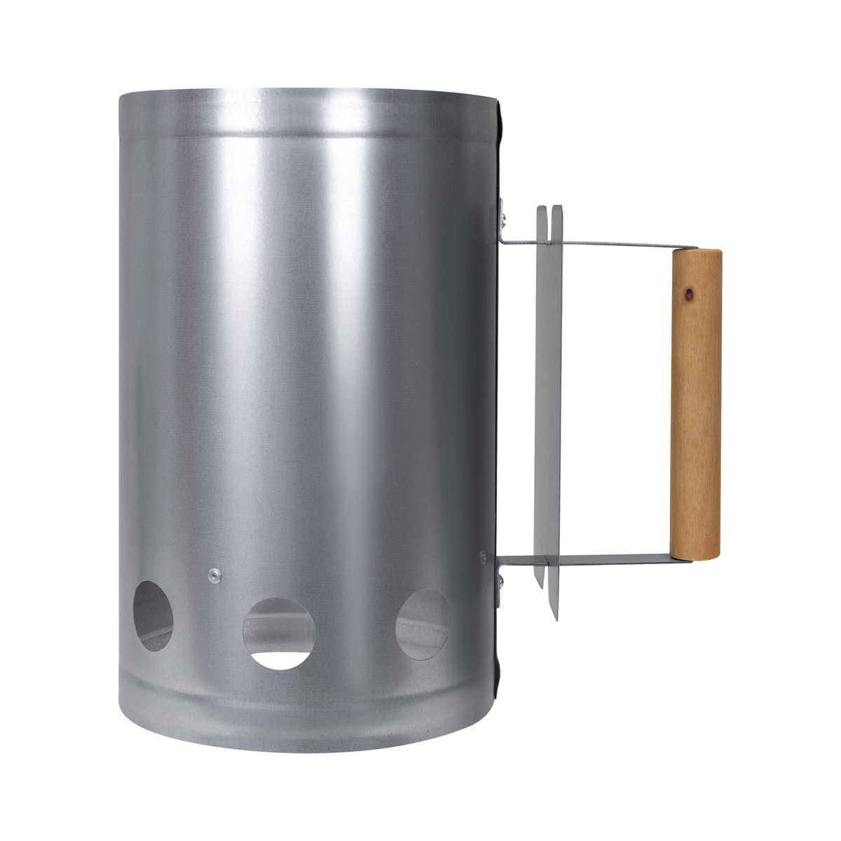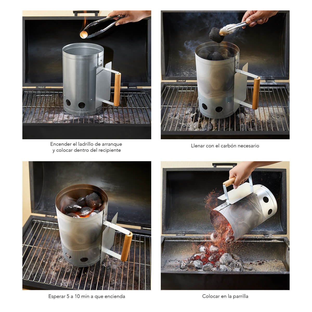 INICIADOR DE CARBÓN TYRA - Pared de acero inoxidable. Incluye mango diseñado ergonómicamente, no resbala y permite una fácil manipulación. Este práctico accesorio acelera el proceso de encendido de carbón sin necesidad de químicos, asegurando brasas uniformes para disfrutar de una cocción perfecta. Fabricado con materiales resistentes al calor, su diseño con orificios estratégicos optimiza el flujo de aire para un encendido fácil y controlado. Capacidad de hasta 2kg.