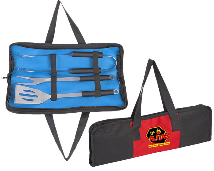 MAR Y TIERRA - Estuche portátil con utensilios para BBQ. Incluye: pinzas para carne, tenedor y volteador.
