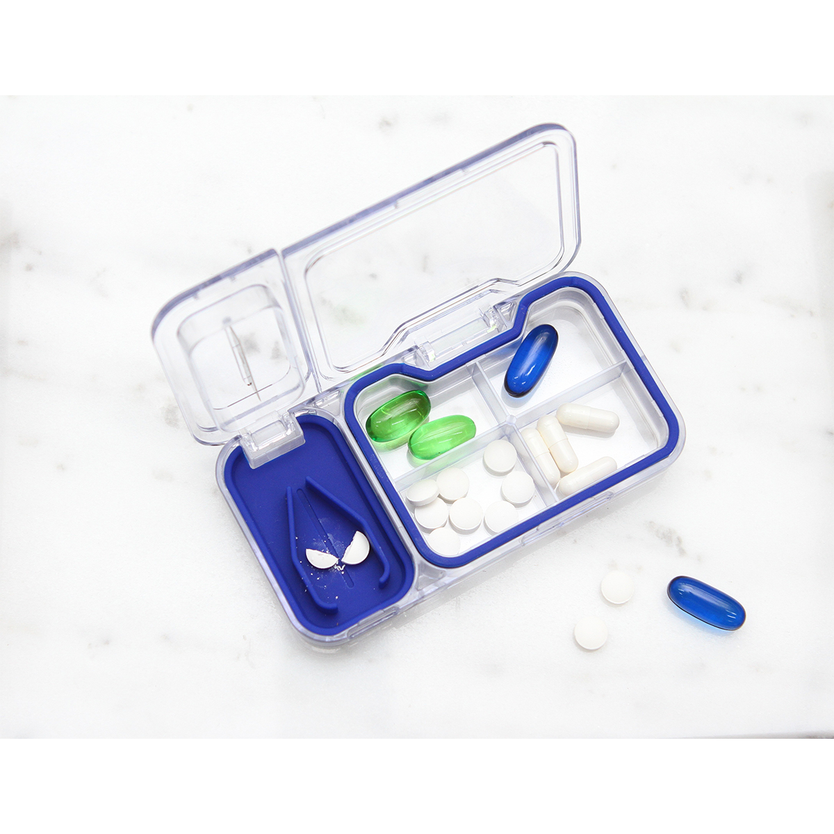 Pastillero Bresse. - Pastillero fabricado en plástico tipo PS, con silicón en la tapa para un mejor cerrado, incluye navaja de acero inoxidable. Tiene 4 compartimentos espaciosos perfectos para píldoras, pastillas, tabletas, etcétera.