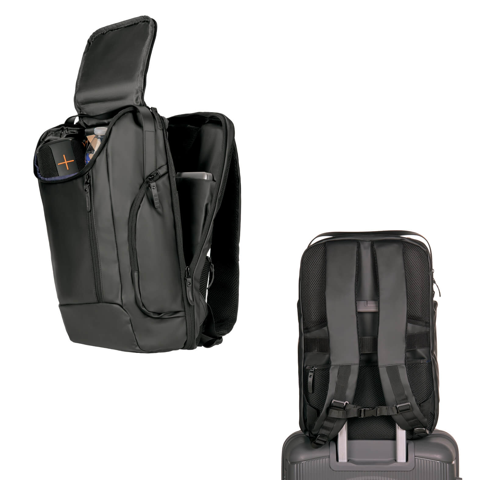 PEARY Mochila con compartimento principal, una bolsa frontal, dos bolsas laterales con cierre, compartimento trasero para laptop de 17.5" con abertura 360, respaldo acolchado con bolsa de seguridad con cierre, banda carry-on, tirantes con broche y asa superior.