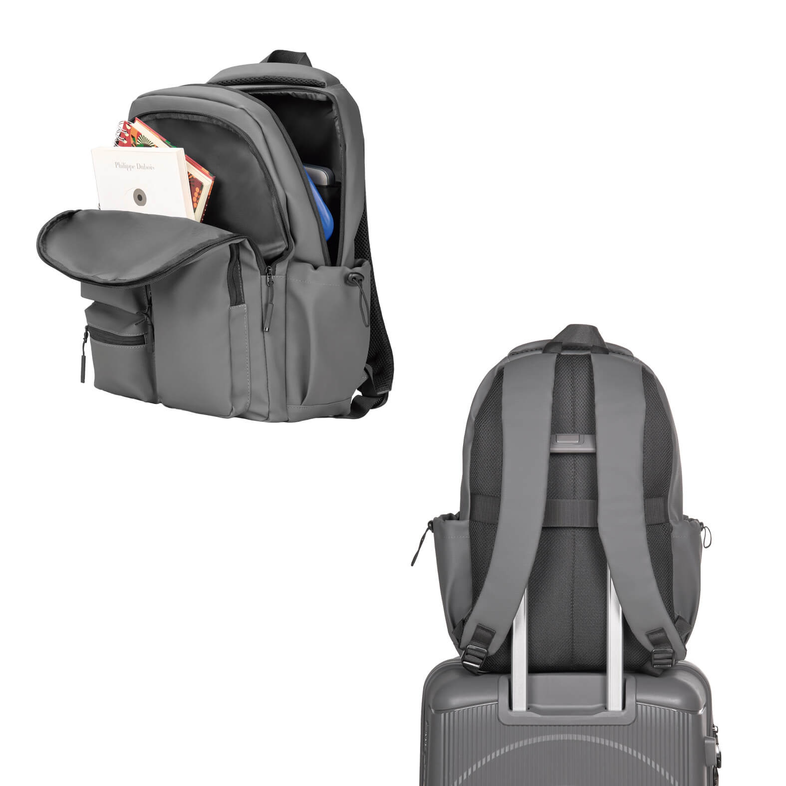 ROALD Mochila con compartimento principal con porta laptop de 17", cuatro compartimentos frontales de diferentes tamaños con cierre, dos bolsas laterales, respaldo y tirantes acolchados, asi como asa superior.