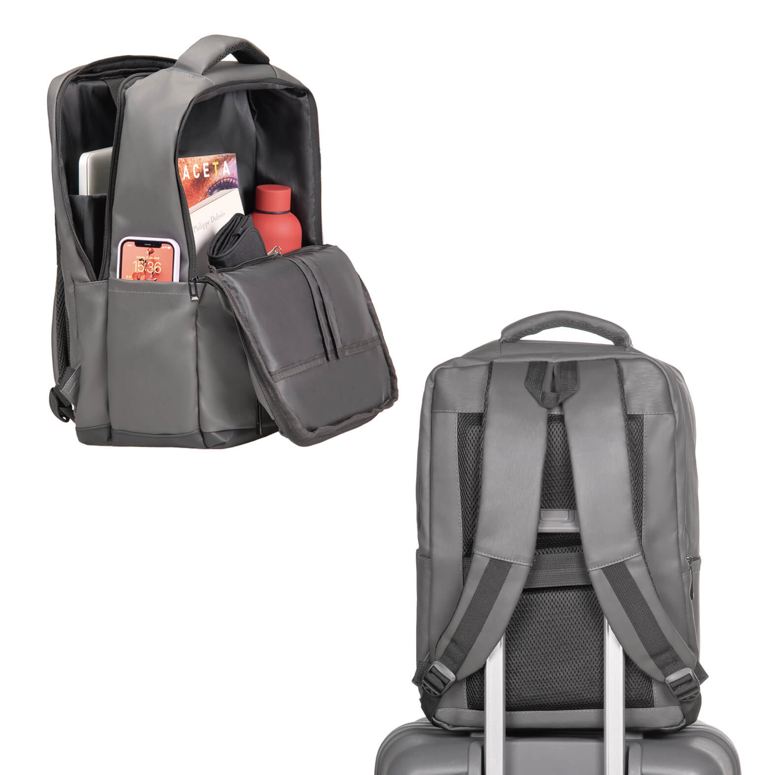 NASEN Mochila con compartimento principal con organizador interno y bolsa con cierre, compartimento trasero con porta laptop de 16.5", dos bolsas frontales con cierre, dos bolsas laterales, respaldo acolchado con banda carry-on y asa superior.
