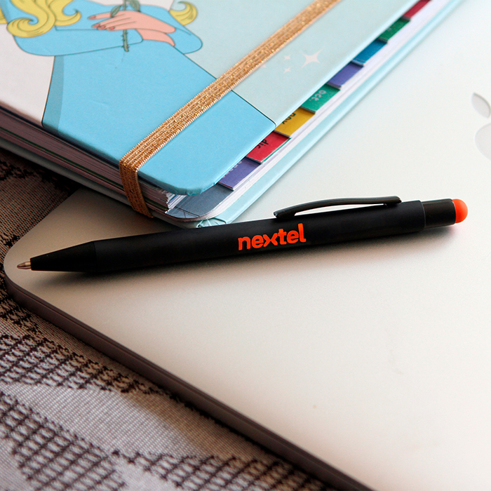 Bolígrafo en aluminio Bursa. - Bolígrafo retráctil fabricado en aluminio terminado Rubber (el grabado destapa en color del puntero touch) con puntero touch, tinta de escritura negra.