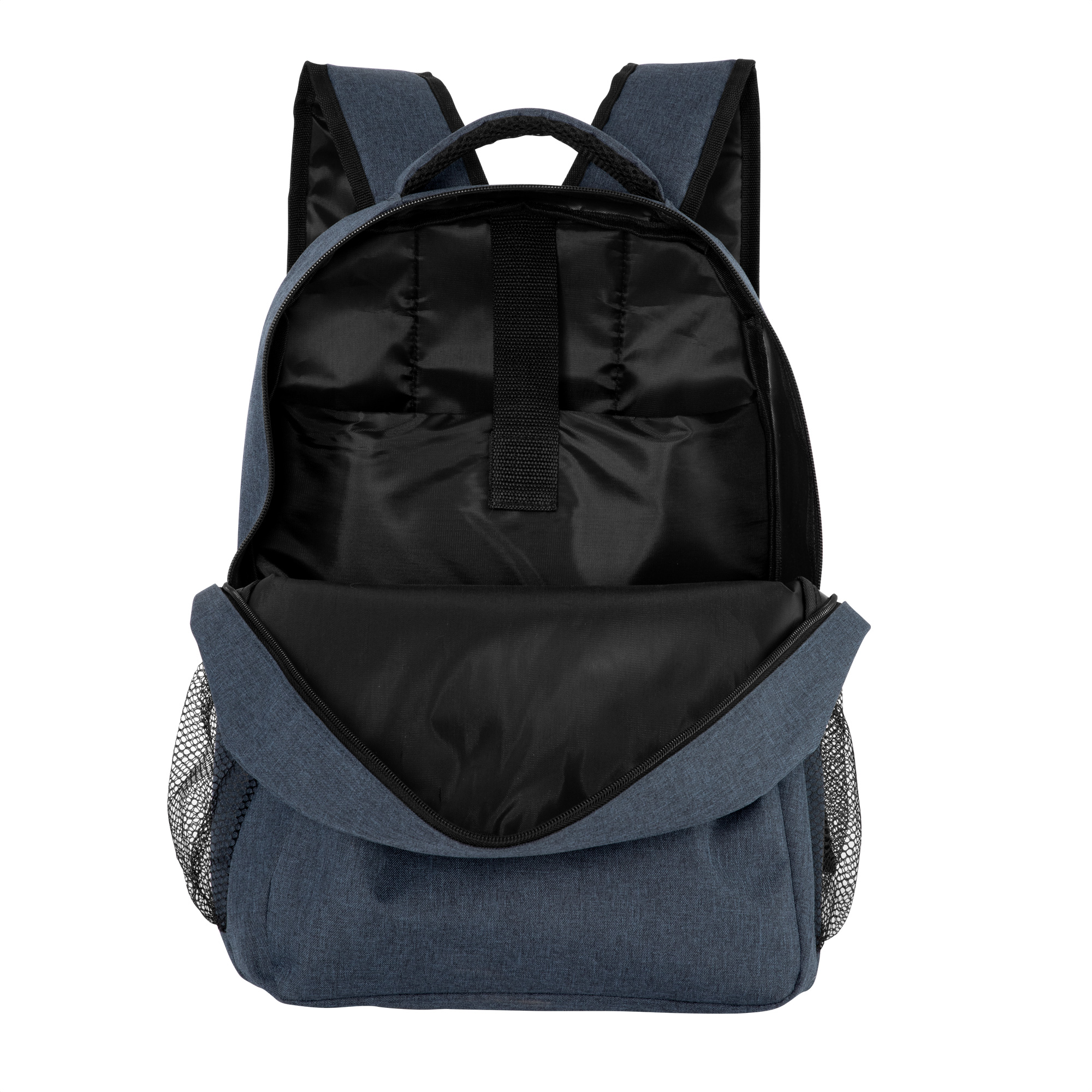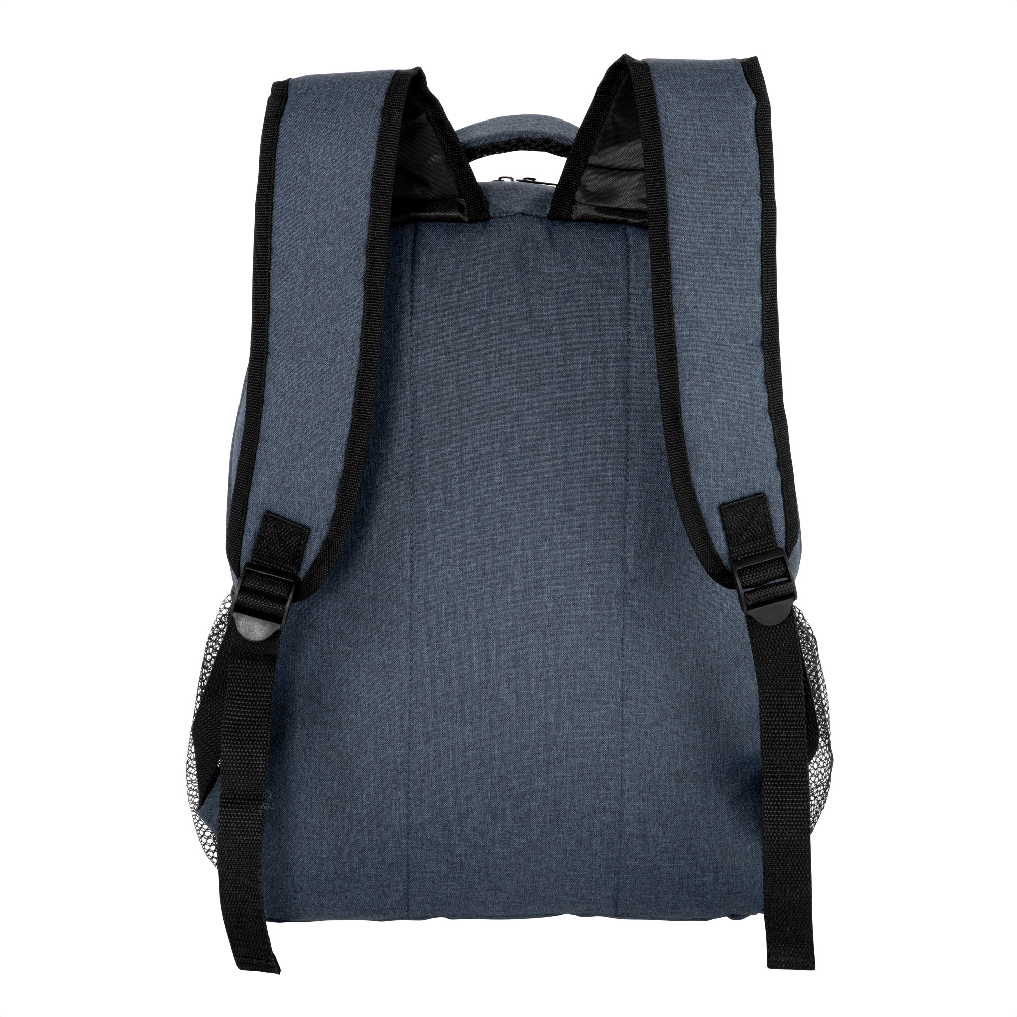 Mochila "ELEMENTAL" Mochila portanotebook de hasta 16 pulgadas. Compartimento principal con cierre bidireccional. Interior con bolsillo acolchado portanotebook y cierre con velcro. Amplio bolsillo frontal horizontal con cierre. Dos bolsillos laterales de red elastizados porta botellas y accesorios. Asa superior, correas y espalda acolchados. Correas ajustables. Tiradores de cierres metálicos color negro