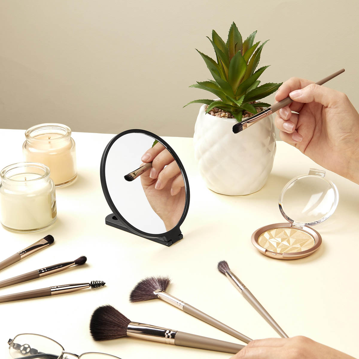 ESPEJO ALESSIA - Espejo circular de mano con asa plegable. Su asa multifuncional se convierte en soporte y tiene un orificio para colgarlo fácilmente donde lo requieras.