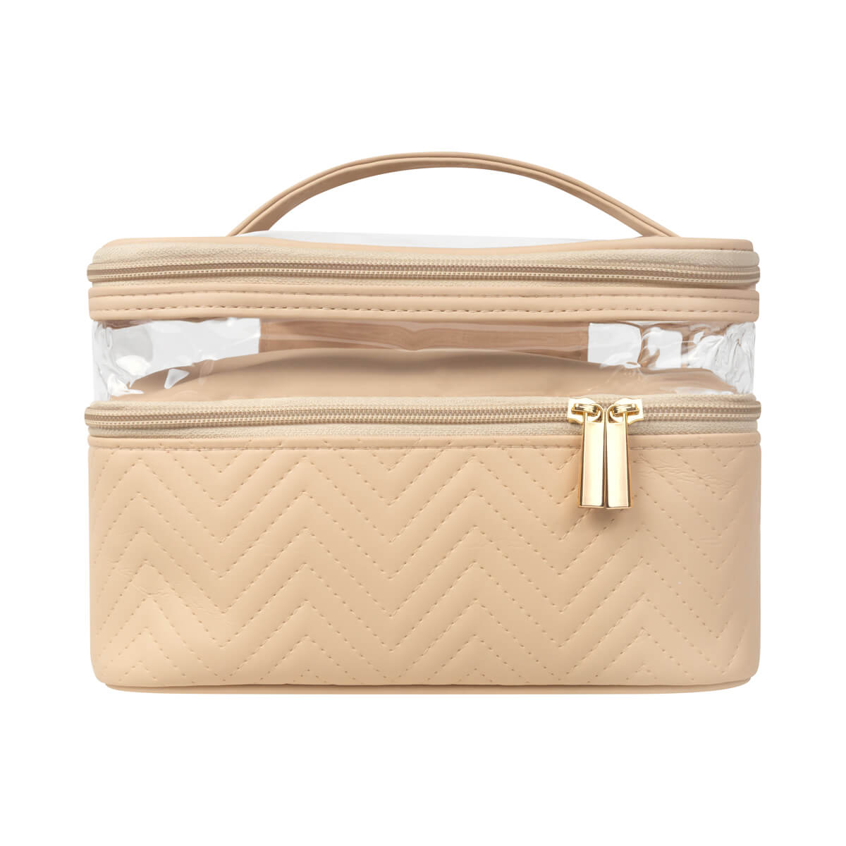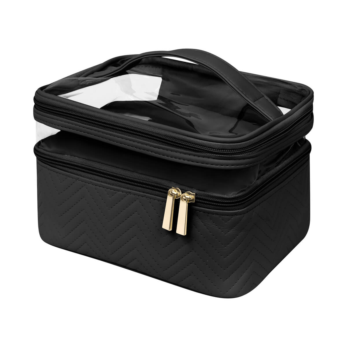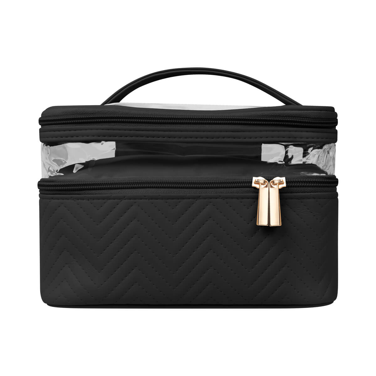 NECESER YARA - Neceser fabricado en PU con cuerpo semirrígido. Cuenta con dos niveles con cierre, ideales para organizar y separar productos de belleza o higiene personal. Su panel superior de mica transparente permite visualizar el contenido fácilmente, mientras que el asa facilita su transporte. Ideal para guardar productos de belleza, cuidado personal o maquillaje.