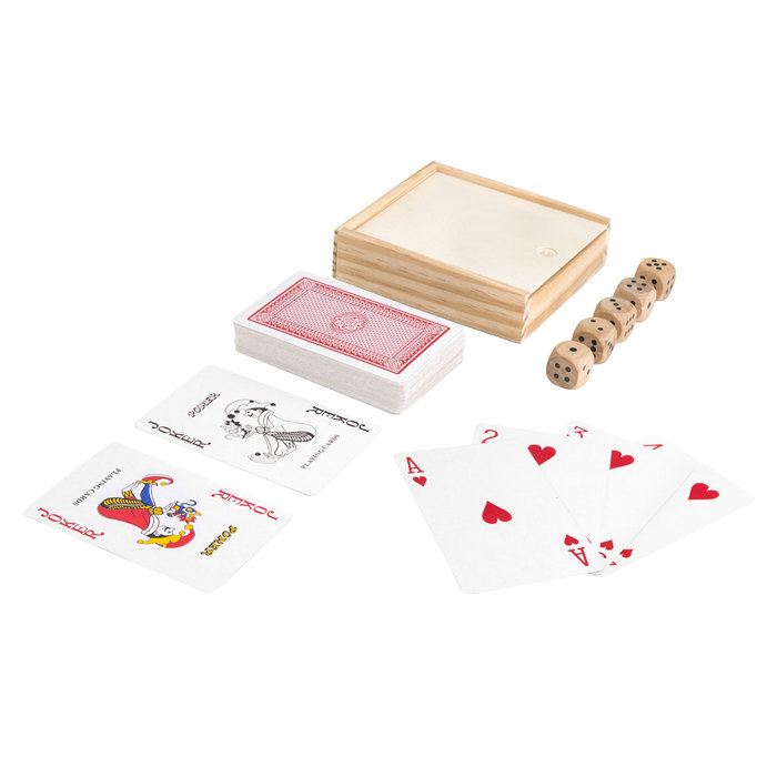 SET DE JUEGOS "PLAYER" Set de entretenimiento. Incluye: 1 juego de cartas de poker plastificadas y 5 dados de madera de cerezo. Caja contenedora de madera de pino y tapa en polywood. Presentación en caja de regalo kraft.