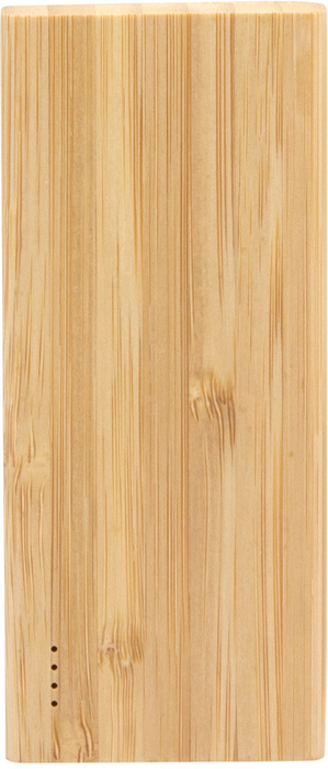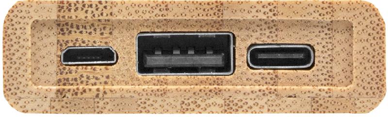 POWER BANK "BAMBPOWER" Power bank. Batería portátil con 1 puerto de entrada micro + 1 tipo C y 1 puerto de salida USB. Entrada y salida: 5V/2A. Indicador de potencia de 4 leds. Cable de carga USB tipo C de 30cm de largo en color blanco. Tiene múltiples protecciones (protección de carga y descarga, protección de sobrecarga y protección de corto circuito). Presentación en caja de regalo kraft.