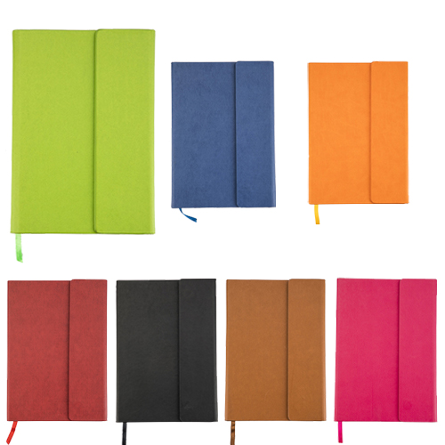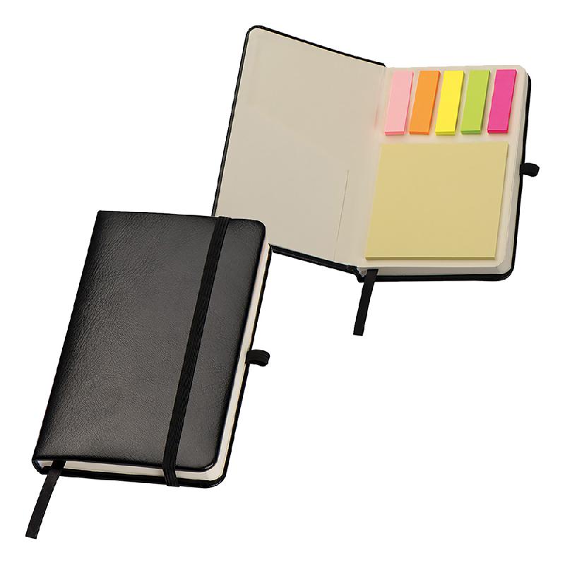 Libreta Dakota Carátula doble vista. Bolsillo al frente para tarjetas. Cinta divisoria Aprox. 80 hojas rayadas. Colores: Gris / Negro