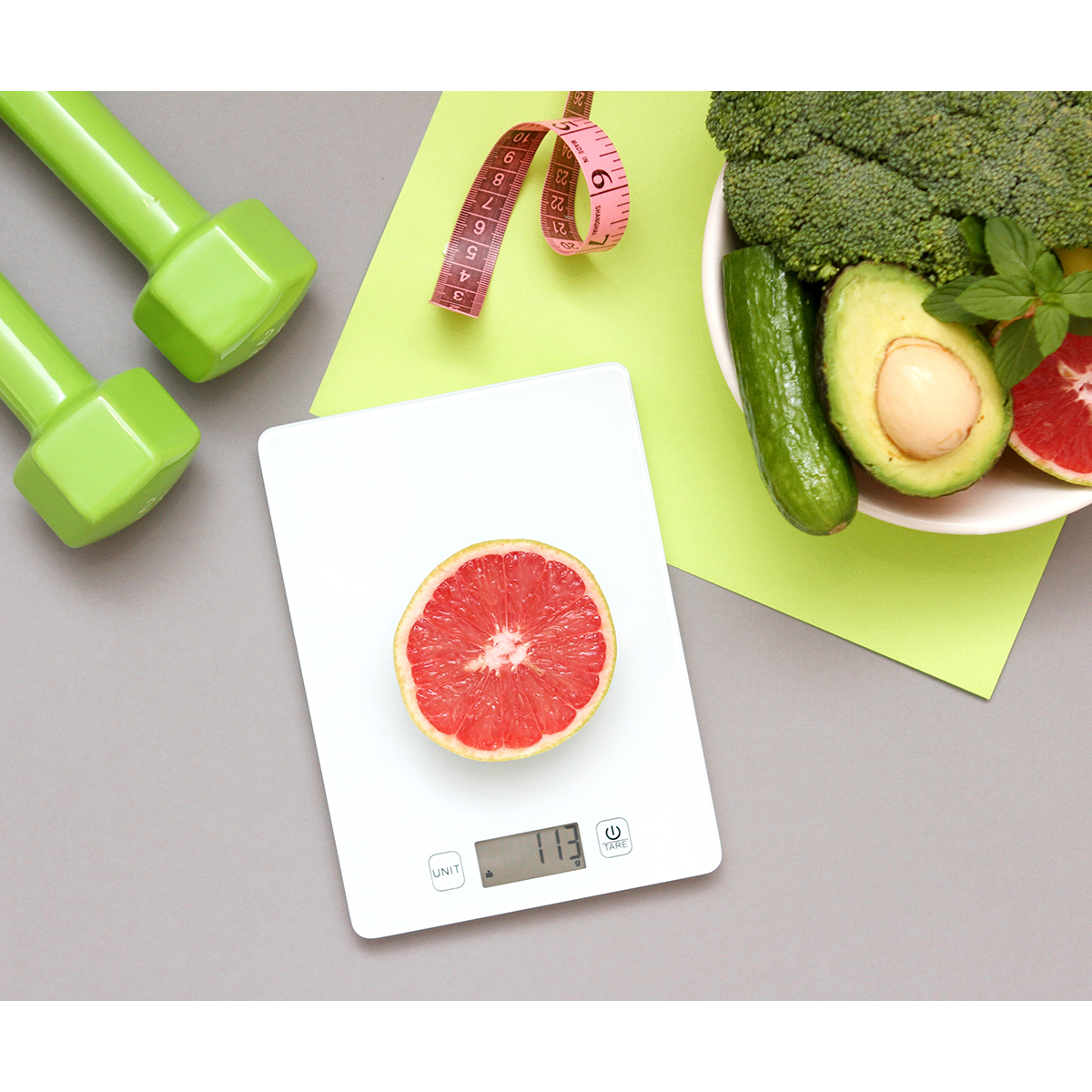 Báscula Scorno. - Báscula electrónica de uso doméstico para alimentos, con diseño tecnológico de alta precisión. Vidrio templado de 3mm. Capacidad 5Kg u 11 libras.
