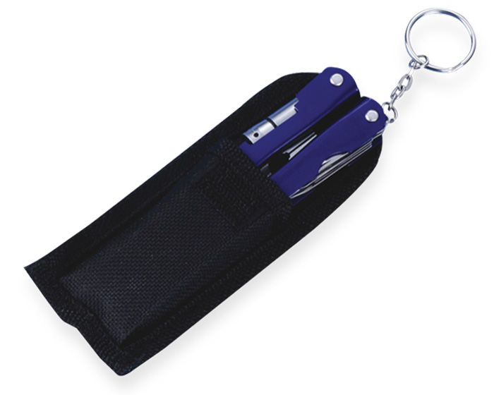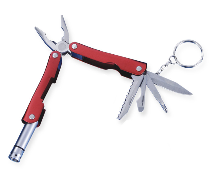 MULTITOOLS - Llavero herramienta multiusos. Con pinzas, navaja, lámpara LED de luz blanca, sierra, desarmador y destapador. Incluye funda. Presentación: caja individual.