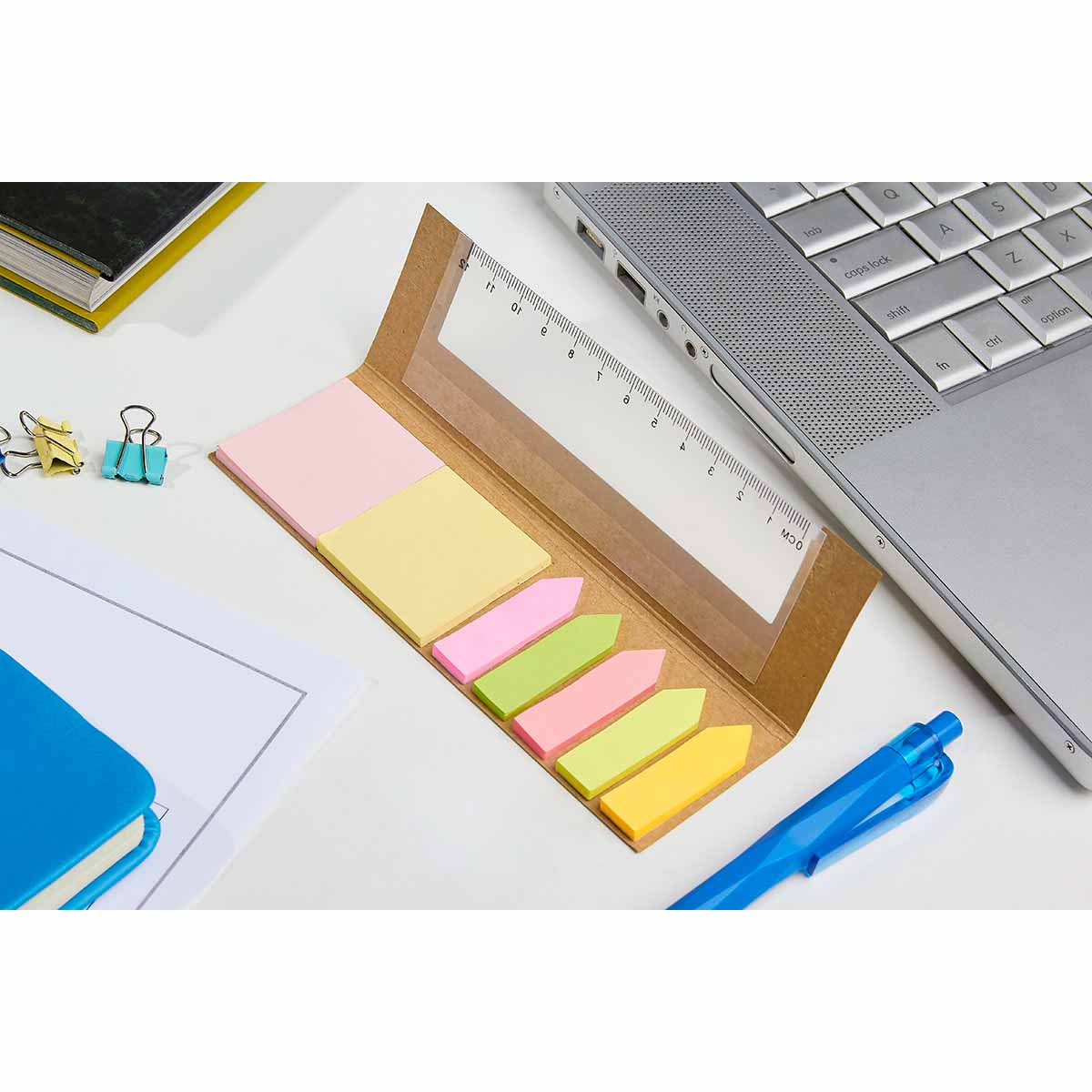 PORTA NOTAS LULE - Incluye notas adheribles: 25 amarillas, 25 rosas y banderillas de 5 colores. Regla de 12 cm en la cubierta.