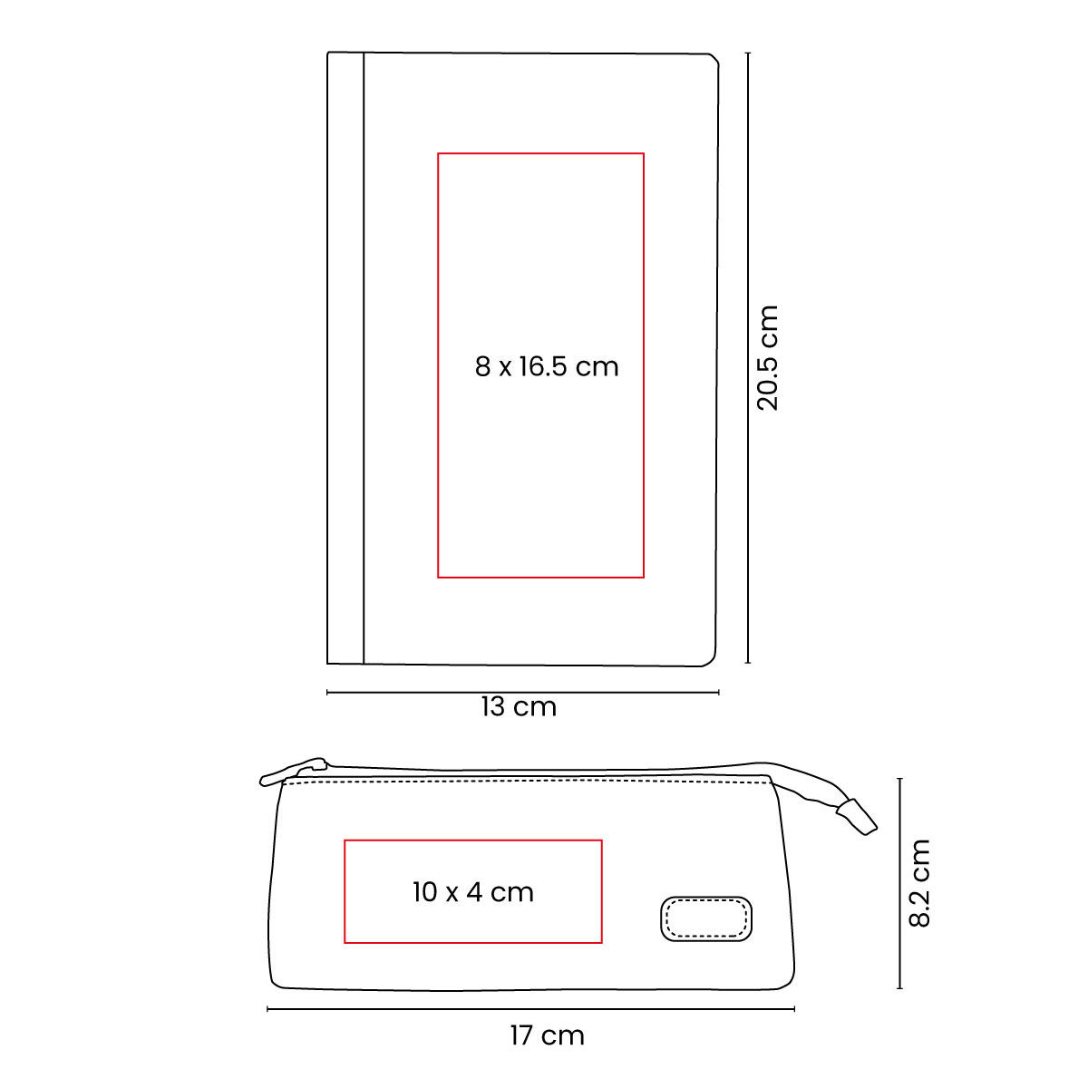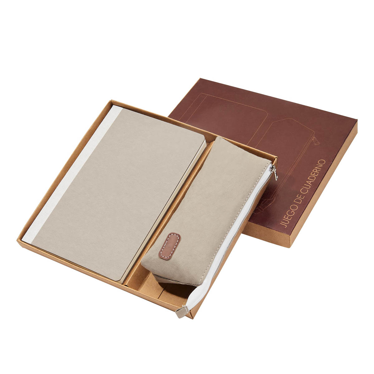 MATERIAL: Cartón / Papel MEDIDAS: 22 x 21 x 2 cm (caja) / 13 x 20.5 cm (libreta)17 x 8.2 x 4.5 cm (estuche) IMPRESION: Serigrafía MED. EMPAQUE: 46 x 26 x 25 cm PESO EMPAQUE: 1.54 Kg PIEZAS EMPAQUE: 20