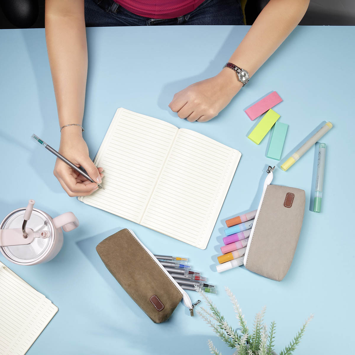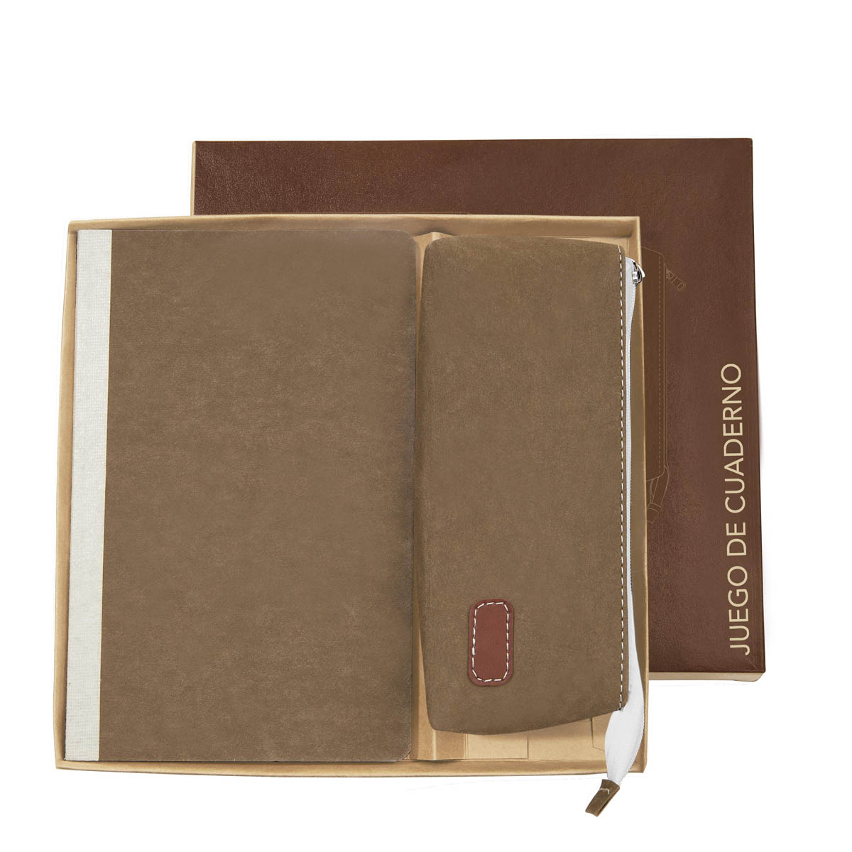 SET ECO VAVIRI - Set ecológico. Incluye libreta con 80 hojas a rayas y cubierta rígida de cartón kraft. Incluye un estuche porta-lapices de apertura con cierre y parche de curpiel, que le da un toque más elegante. La combinación de materiales, lo hace un producto perfecto para quienes buscan un equilibrio entre funcionalidad y sustentabilidad. Incluye caja individual.
