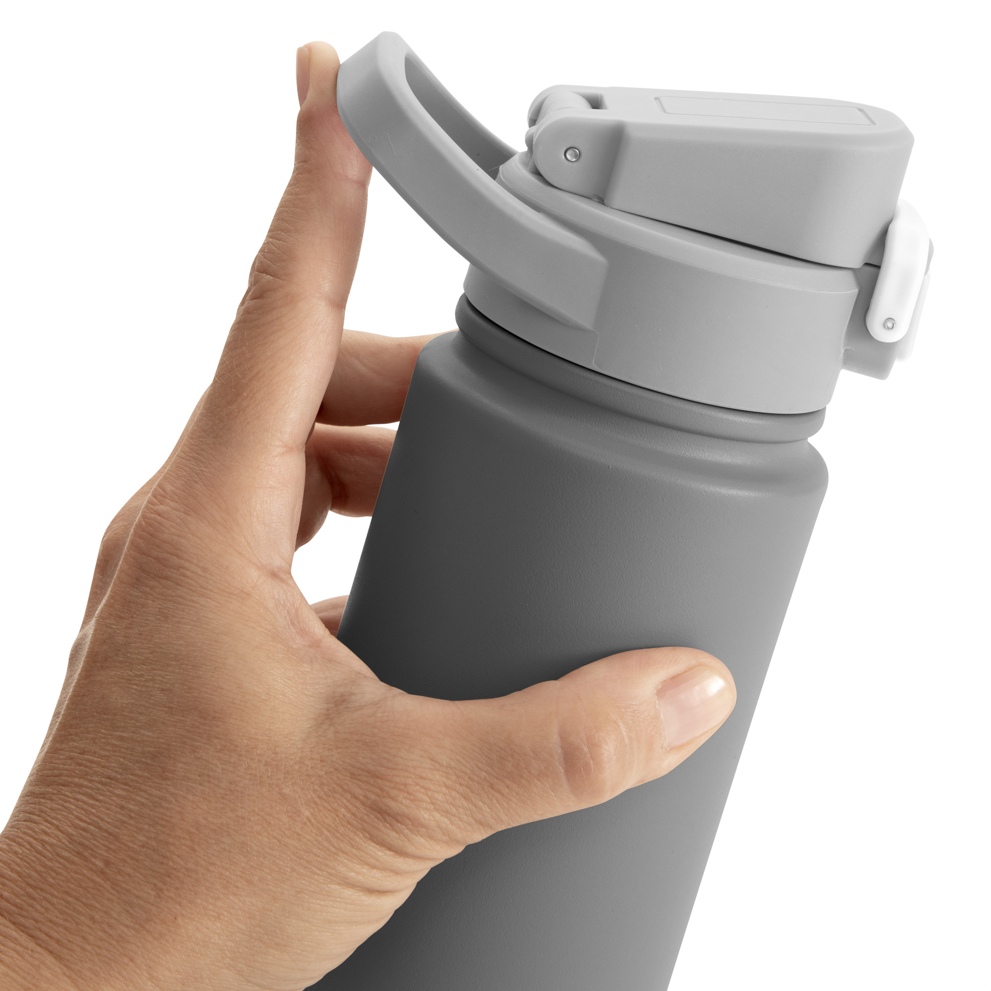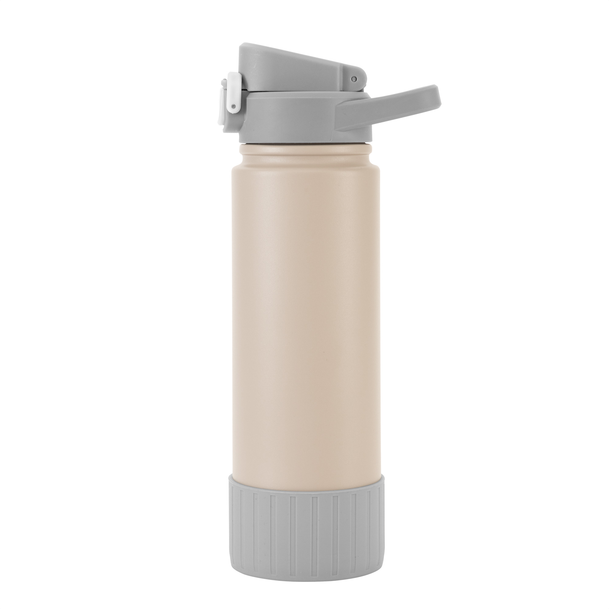 Botella térmica "RIBB" Botella deportiva con doble pared, sellada al vacío. Interior de acero 304 y exterior de acero 201. Pintura powder coat (pintura más duradera y resistente a la corrosión y el paso del tiempo). Tapa plástica a rosca con anillo de silicona combinada con tapa rebatible a presión y traba de seguridad antiderrame. Asa flexible y resistente de TPE. Boquilla con bombilla incluida. Base con grip de silicona del mismo color de la tapa. Mantiene hasta 12 hs la temperatura de las bebidas calientes y hasta 24 hs de las bebidas frías