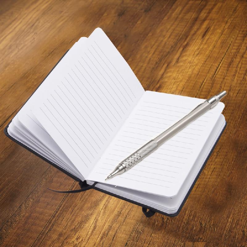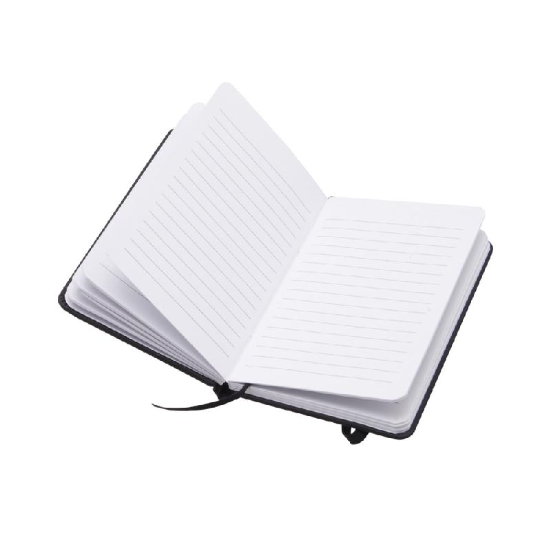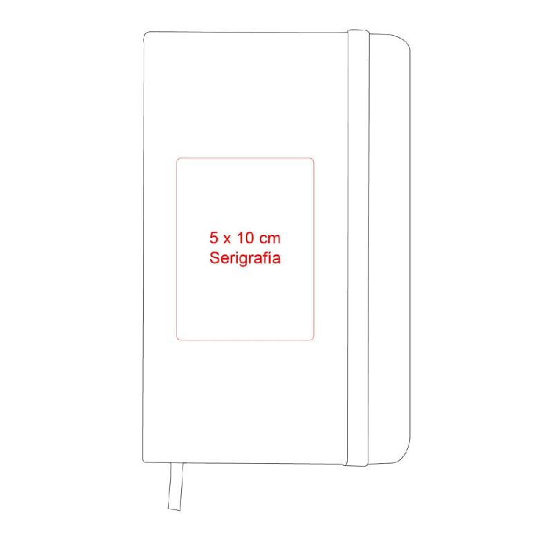 Libreta de bolsillo con cinta elástica para cerrar. Medidas: 7.8 x 13 cm Material: Poliuretano. Empaque: Bolsa de celofán.
