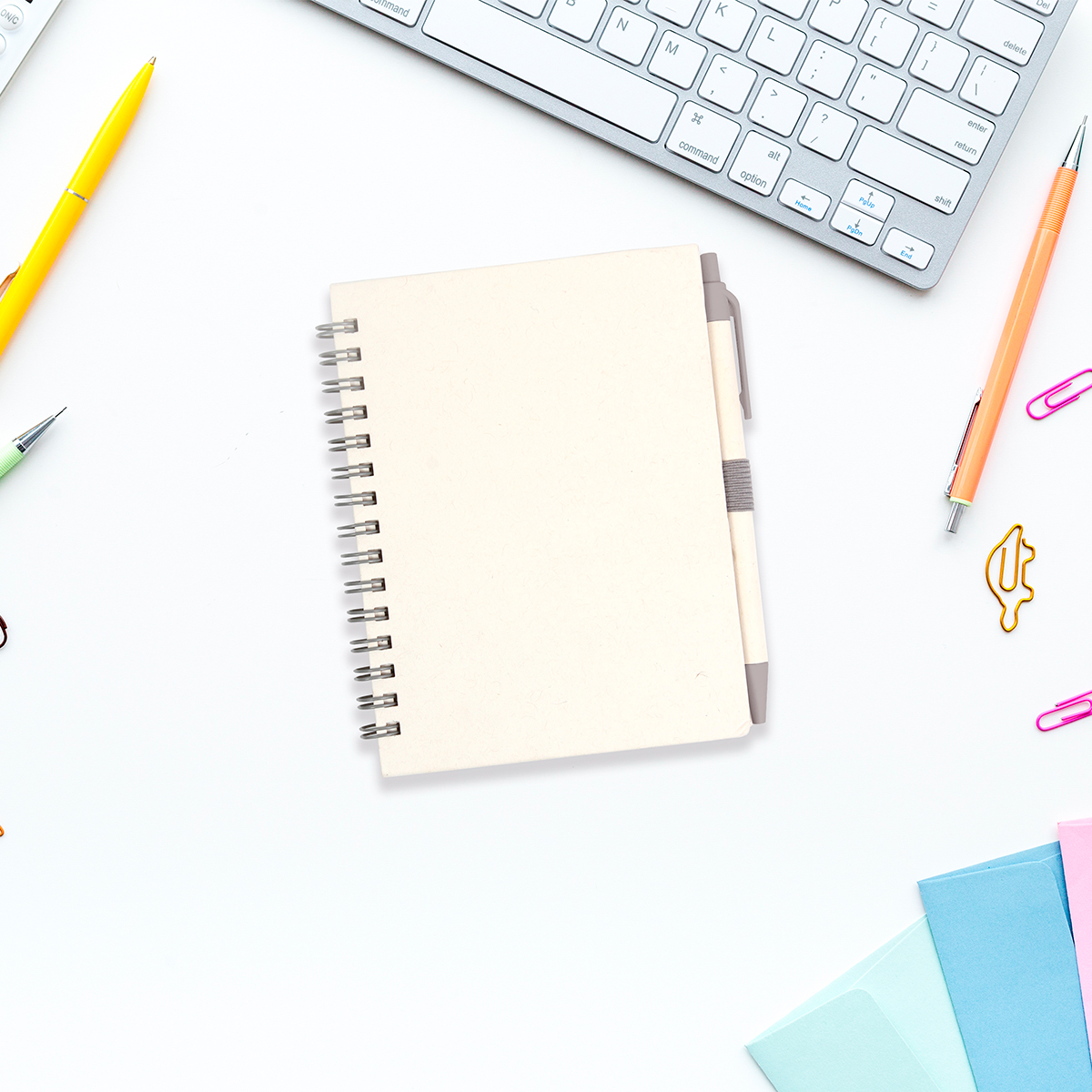 Libreta Palimé. - Libreta fabricada en milk paper (cartones de leche reciclados) con espiral metálico, banda elástica porta bolígrafo y bolígrafo con barril de milk paper y detalles en plástico PLA. 70 hojas rayadas de 80 gr. Tamaño A6. Esta libreta es una opción sostenible y funcional para aquellos que buscan una alternativa eco-amigable en sus artículos de papelería.