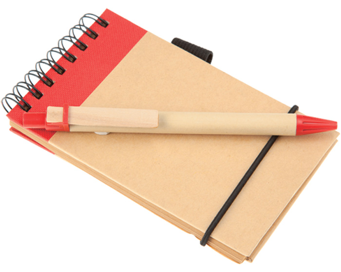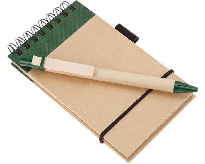 GREEN LIFE - Libreta de papel reciclado con 50 hojas rayadas (100 páginas), espiral metálico color negro y cinta elástica. Incluye bolígrafo de papel con clip de madera.