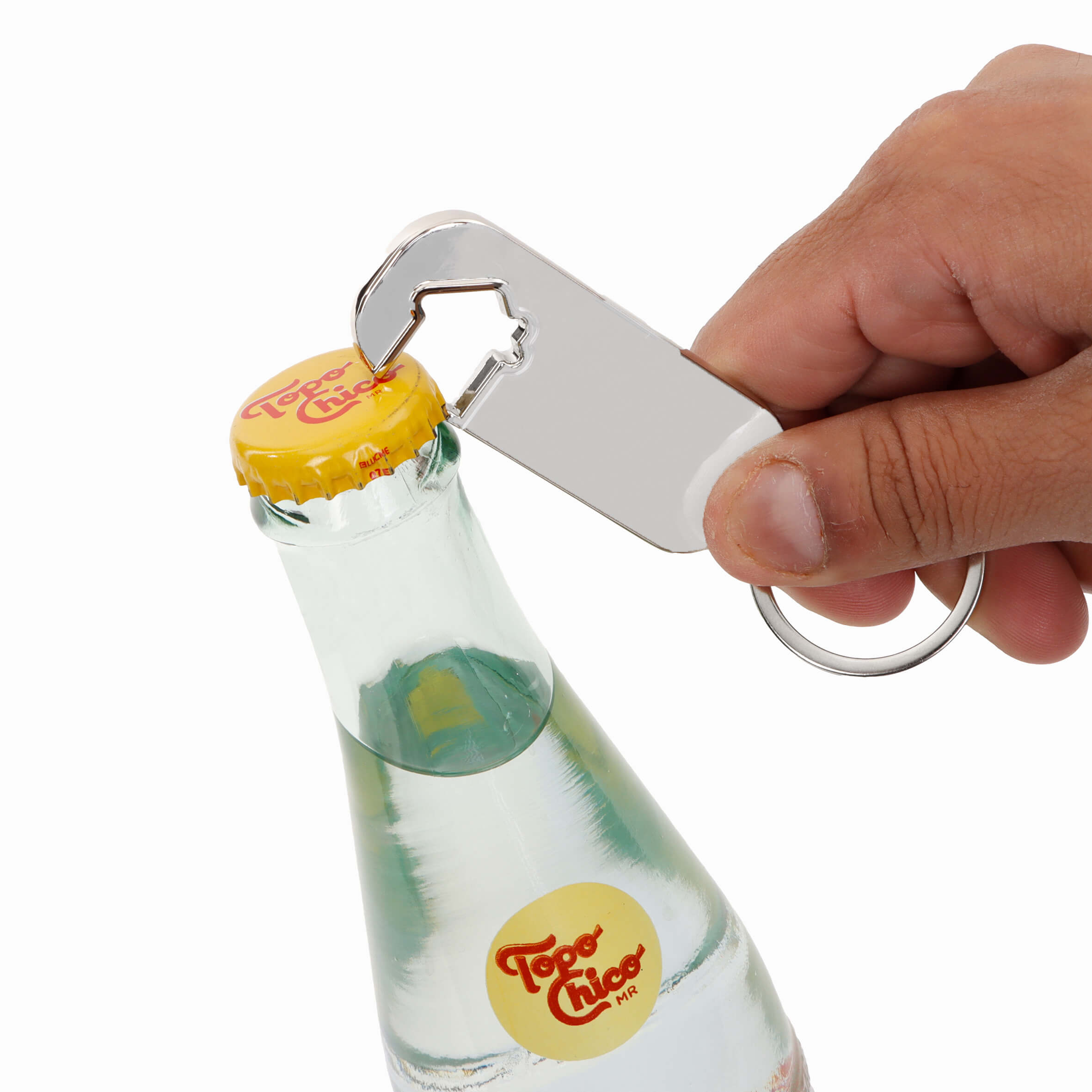 OKANIS Llavero metálico rectangular con diseño interno en forma de casa que sirve como destapador.