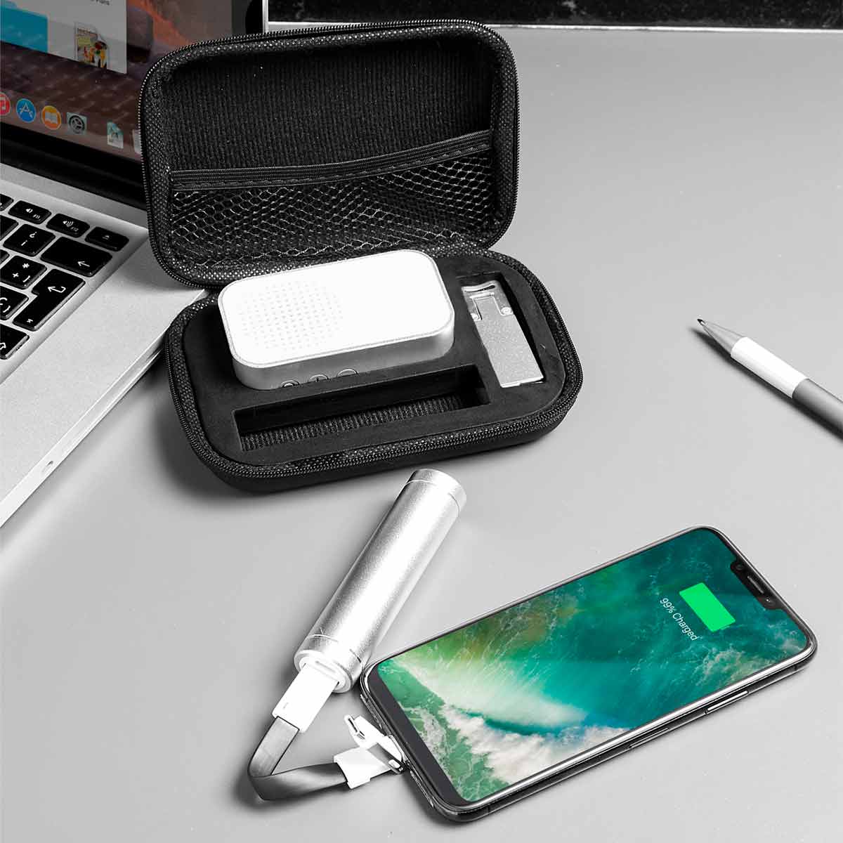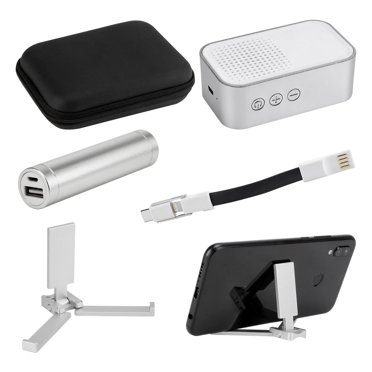 SET KRALOVE - Incluye bocina bluetooth, batería auxiliar de 2,600 mAh, cable cargador y de transferencia de datos compatible con micro USB, 8 pin y tipo C, soporte para smartphone y estuche. Este producto por ser últimas piezas puede presentar alguna variación, no se aceptan devoluciones.