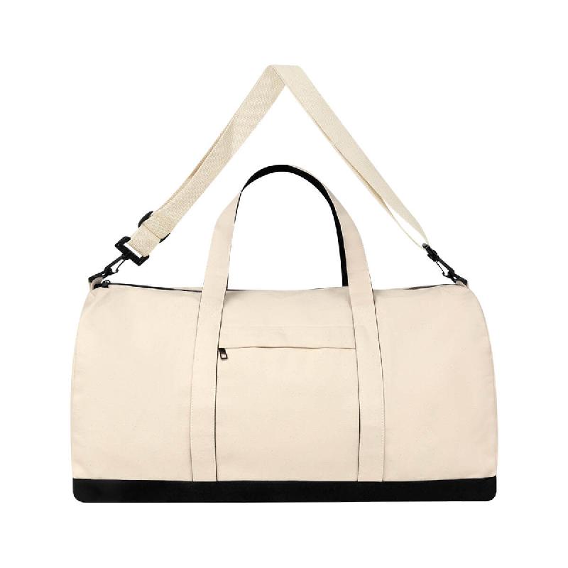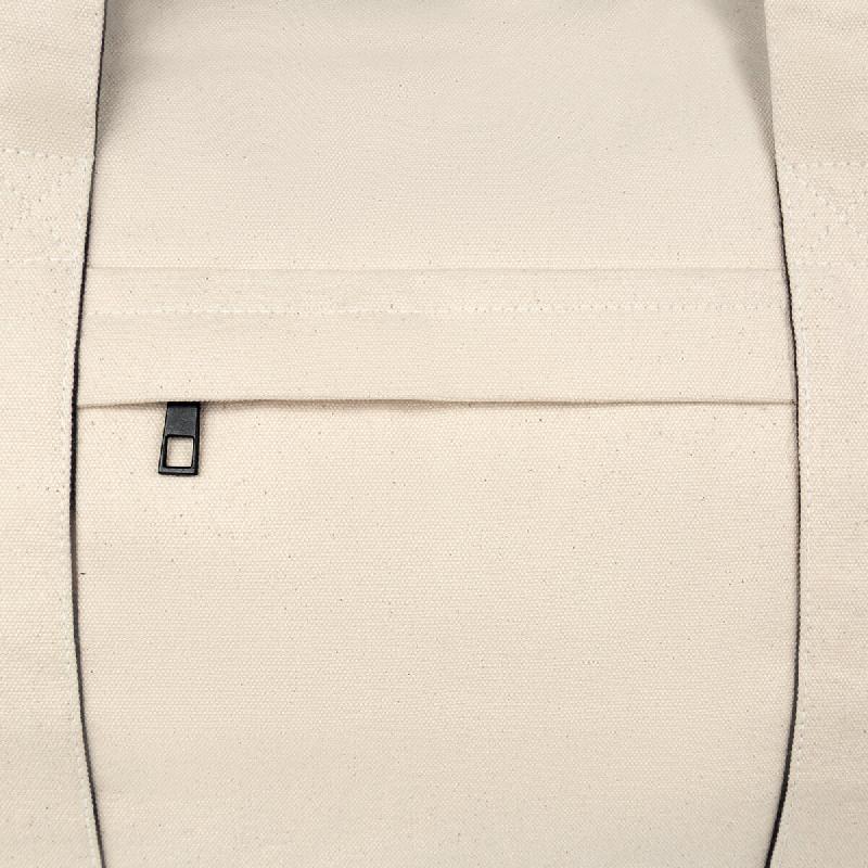 MALETA LECCO - Su compartimento principal con cierre destaca por su tamaño súper amplio, perfecto para llevar todo lo necesario con comodidad. Incluye asas de mano para un fácil agarre y una práctica asa para hombro removible, sujeta con un broche de plástico para mayor seguridad. Además, cuenta con un bolsillo frontal con cierre que brinda acceso rápido a objetos pequeños o esenciales. Esta maleta ecológica está fabricada con material algodón, es la compañera ideal para viajes o escapadas de fin de semana.