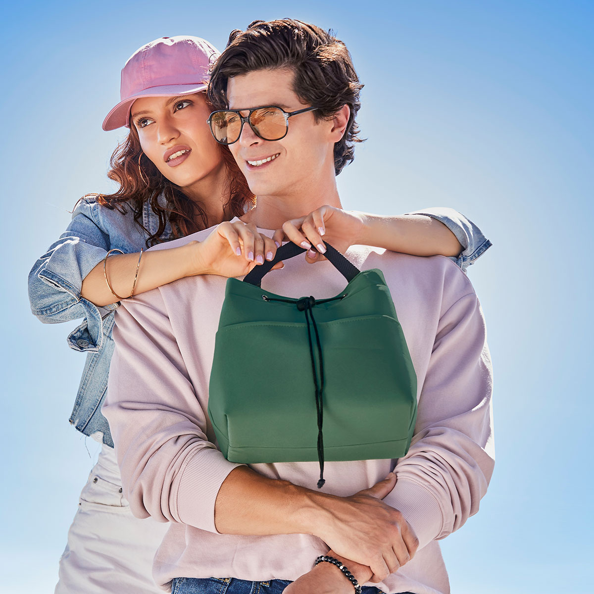 LONCHERA IKEL - Lonchera con interior plastificado. Su compartimento principal cuenta con un cierre tipo jareta, ideal para ajustar a varios tamaños, según cada necesidad. Su bolsillo frontal permite llevar accesorios pequeños y complementar tu lunch. Ideal para la escuela u oficina, lleva tus alimentos con estilo y de forma segura. Capacidad 12 latas.