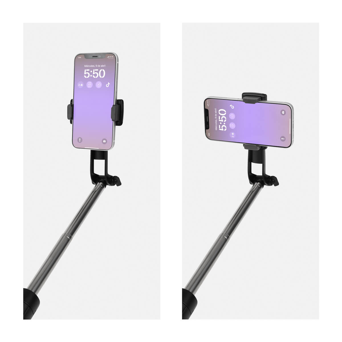 SELFIE STICK SURAT - Selfie stick con tripié amplio para mayor estabilidad. Incluye control remoto Bluetooth con alcance de hasta 10 m, ideal para capturar fotos o videos a distancia. Su brazo extensible de 86 cm y su holder ajustable garantizan ángulos perfectos para cada toma. Perfecto para selfies, videollamadas o grabaciones creativas. El control remoto funciona con batería de botón (incluída).