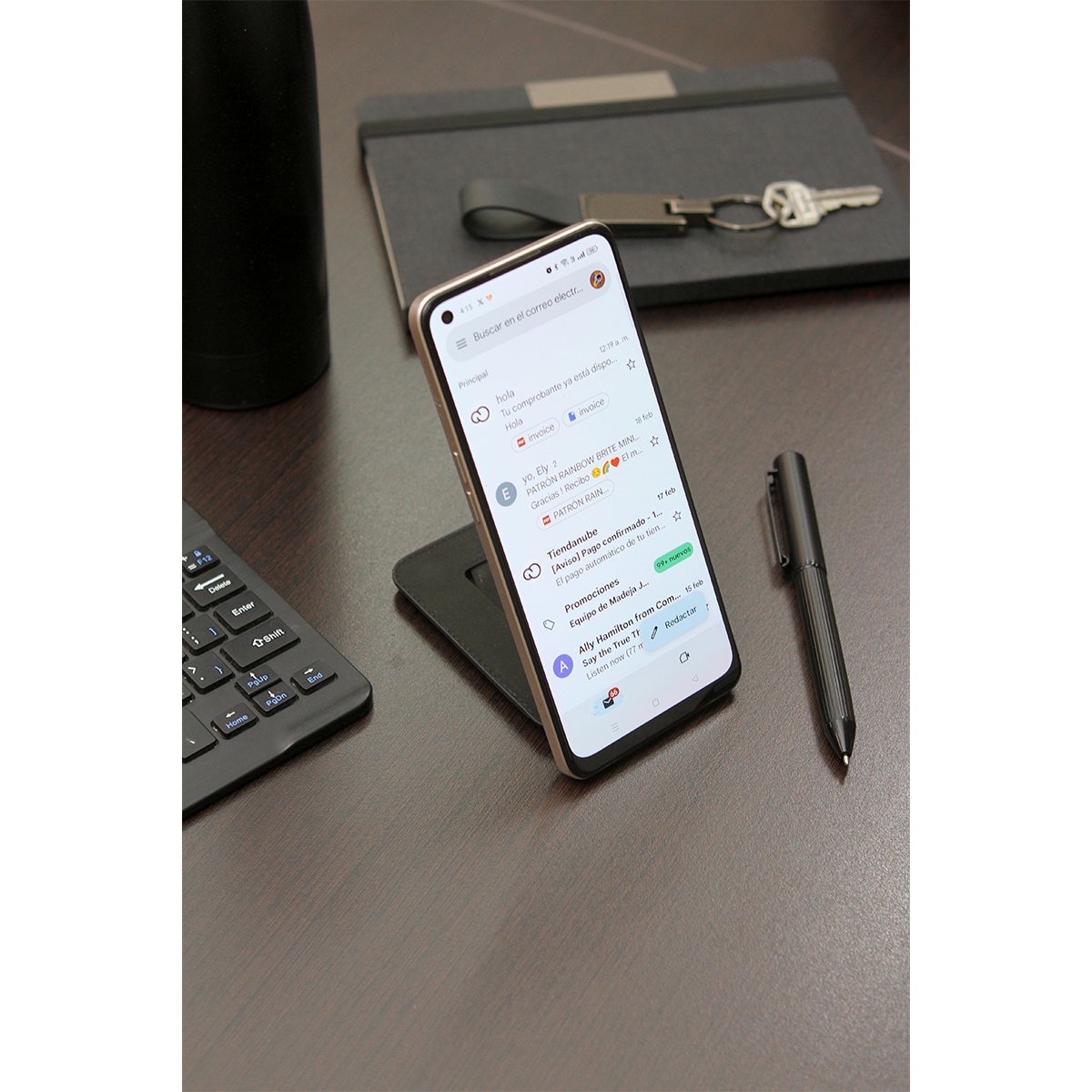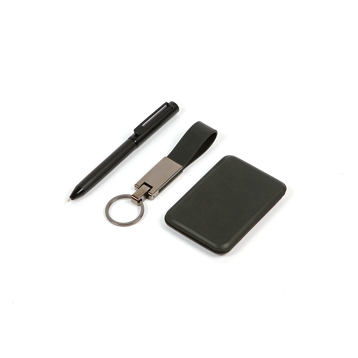 Set Azmoos. - Set ejecutivo, incluye un bolígrafo tipo ball pen con barril fabricado en acero, tinta de escritura negra. Un soporte para teléfono fabricado en curpiel, su hoja de acero inoxidable con imán ayuda a que este se adhiera al teléfono celular para funcionar también como un tarjetero. Un llavero fabricado en acero inoxidable con detalles en curpiel. Incluye una caja de regalo.