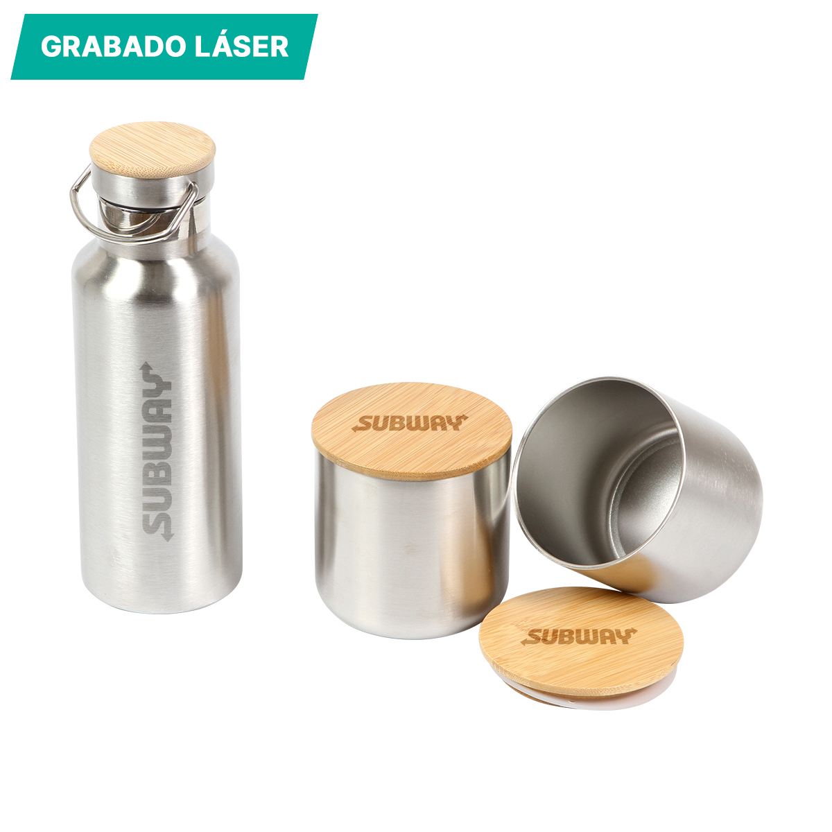 Set Ludvika. - Set de botella y dos tazas, fabricadas en acero inoxidable reciclado doble pared con detalle tipo madera. Capacidad de botella 500 ml., tazas 350 ml. Incluye caja de regalo. El regalo perfecto para los amantes de las aventuras y el estilo.