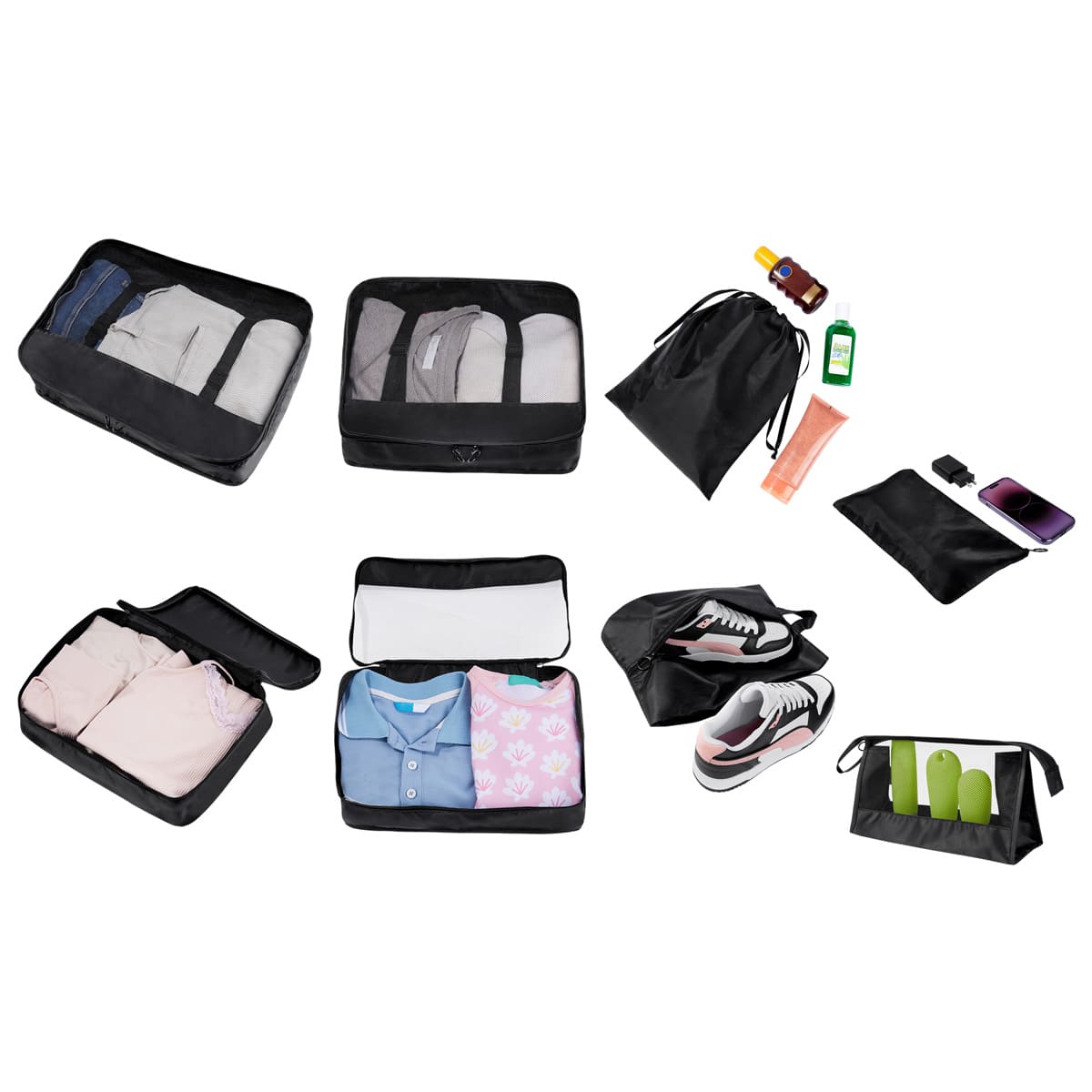 SET ORGANIZADOR DE VIAJE DEVIKA - Organizador de maleta 8 en 1. Incluye 3 bolsas para ropa con malla para una mejor ventilación, la bolsa grande y mediana incluyen dos sujetadores interiores con broche de plástico para organizar tus artículos, además de broches de plástico que te permiten unir las diferentes piezas, 1 bolsa con cierre y asa para ropa interior, 1 bolsa con cierre para calzado, 1 bolsa con cierre tipo jareta, 1 bolsa chica con cierre y 1 bolsa cosmetiquera con malla.