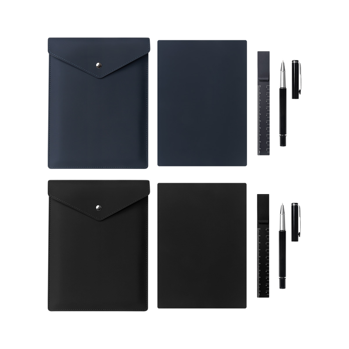 SET LEKI - Set de libreta, regla y bolígrafo. Presentado en un elegante sobre de curpiel. Un conjunto esencial con diseño discreto y profesional: Libreta de 80 hojas a raya, bolígrafo metálico con detalles cromados y regla metálica de 10 cm. Todo cuidadosamente resguardado en un sobre de curpiel con cierre de botón, ideal para quienes aprecian lo práctico con un toque de distinción.
