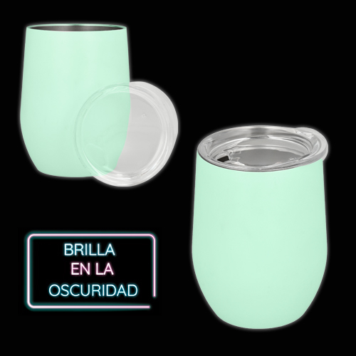 FLUBBER Termo de acero inoxidable con doble pared que brilla en la oscuridad con tapa de cierre a presión transparente.