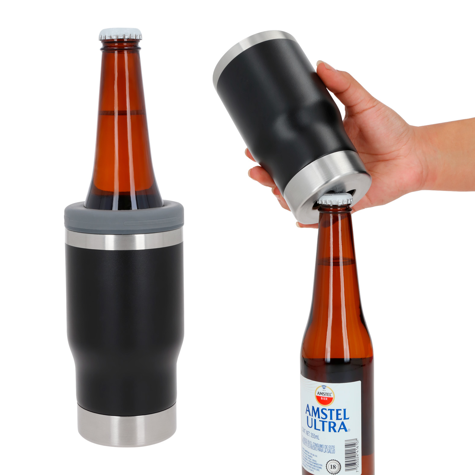 LAIKI Termo con doble pared de acero inoxidable, acabado rugoso, base con destapador y tapa enroscable intercambiable, sirve como porta latas y porta botellas.